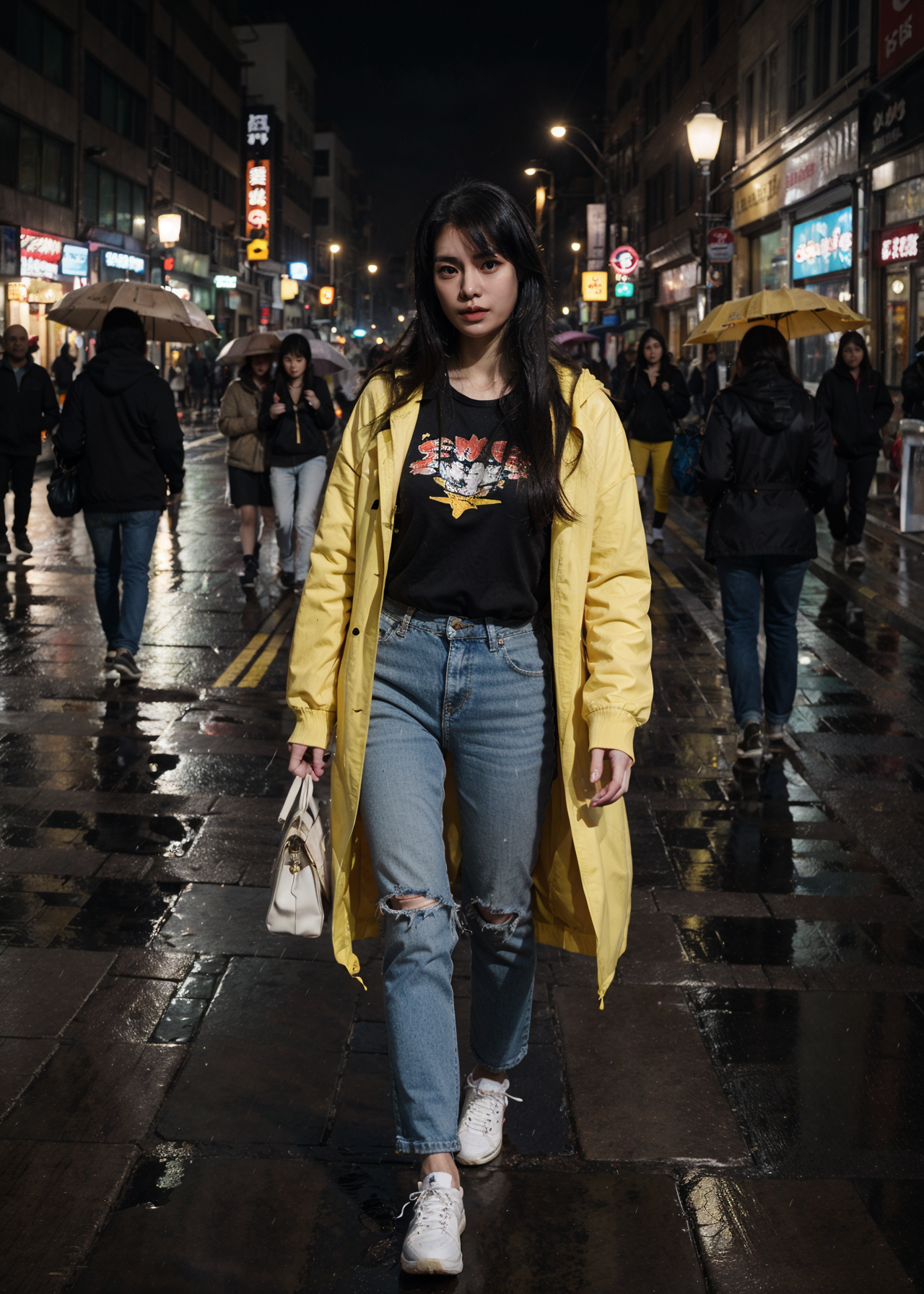 <lora:epi_noiseoffset2, dark studio, rim lighting, two tone lighting:0.3> (full body shot, rim lighting), BREAK <lora:yanzhen, brown eyes, long hair, black hair:0.6> yanzhen, 1girl, solo, bangs, long hair, black hair, female focus, serious, looking at viewer, yellow raincoat, jeans, hood up, holding, umbrella, <lora:epiCRealismHelper:0.4>, <lora:detail_slider_v4:1>, BREAK dark background, shadows, street, raining, foggy,
