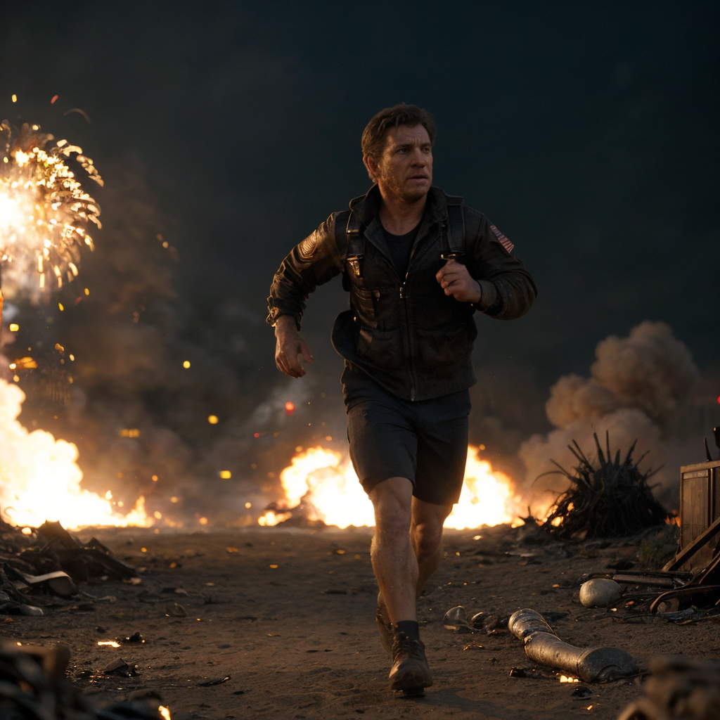 cinematic film still man running away, chaos in the background, explosions fire, USA, 4k epic detailed 4k epic detailed photograph shot on kodak detailed bokeh cinematic hbo, highly detailed, shallow depth of field, vignette, highly detailed, high budget Hollywood film, bokeh, cinemascope, moody, epic, gorgeous, film grain