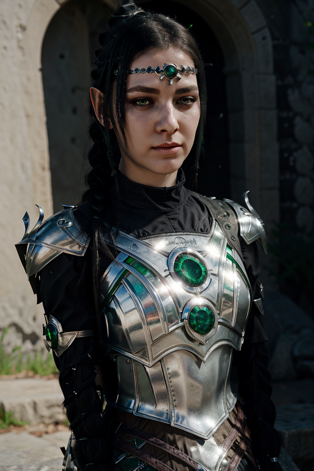 masterpiece, best quality, 1girl, silver armor, shadowheart, black hair, braided ponytail, elf, pale skin, emerald green eyes, (circlet:1.2), looking at viewer, (simple background:0.3), <lora:ShadowHeart:1.0>