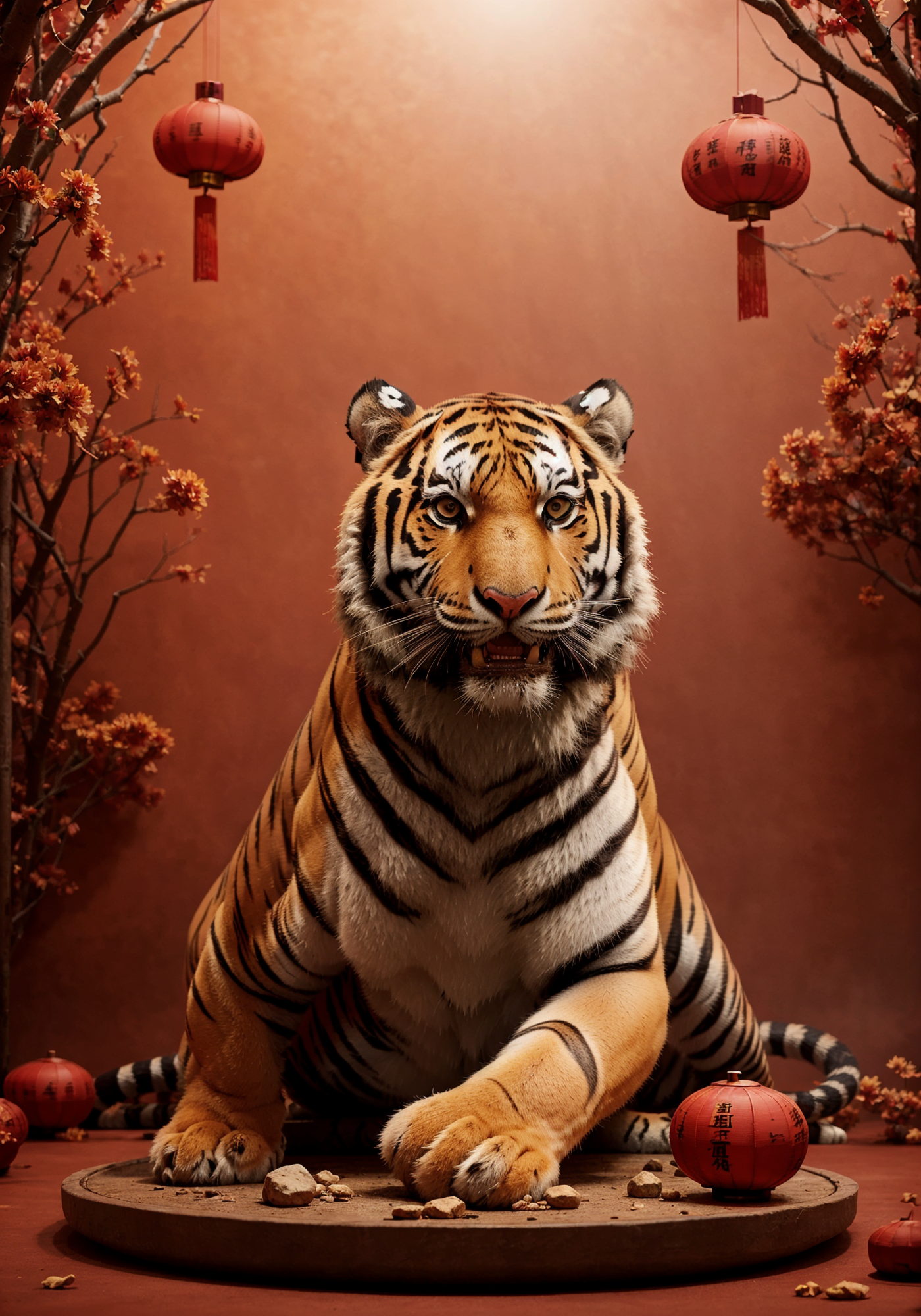 (tiger:1.3),(a fierce northeast tiger:1.1),(the chinese new year:1.3),(red background:1.1),(dramatic, gritty, intense:1.1),masterpiece,best quality,32k uhd,insane details,intricate details,hyperdetailed,hyper quality,high detail,ultra detailed,Masterpiece,photography, in the style of minimalist stage designs,realistic landscapes with soft,tonal colors,rendered in cinema4d,minimalistic elements,tabletop photography,