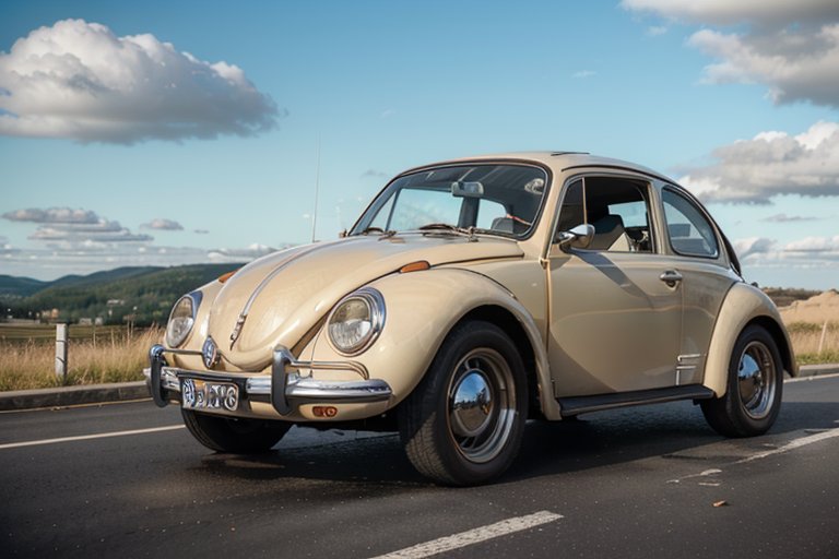 ((three quarter view)), (best quality, masterpiece, award winning), analog photo of a beige Volkswagen Beetle car, golden hour, 1969, film grain, retro, High Detail, Sharp focus, photorealism, realistic, dramatic lighting, epic,cinematic. widebody sports car, lowered, large box fenders, deep dish rims, racing wheels, ground vehicle, motor vehicle,