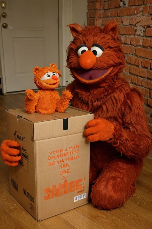 Sesame Street is a funny doll, Elmo is a creepy red monster with an orange nose, drinking apple juice in a cardboard box with the inscription AA,fantasy project,Nikon,super concept, cinema movies,Coolpix.