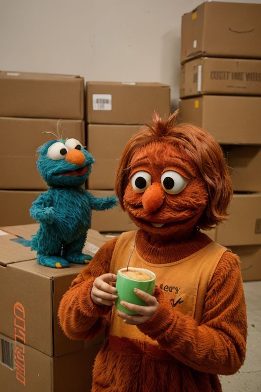Sesame Street is a funny doll, Elmo is a creepy red monster with an orange nose, drinking apple juice in a cardboard box with the inscription AA,fantasy project,Nikon,super concept, cinema movies,Coolpix.