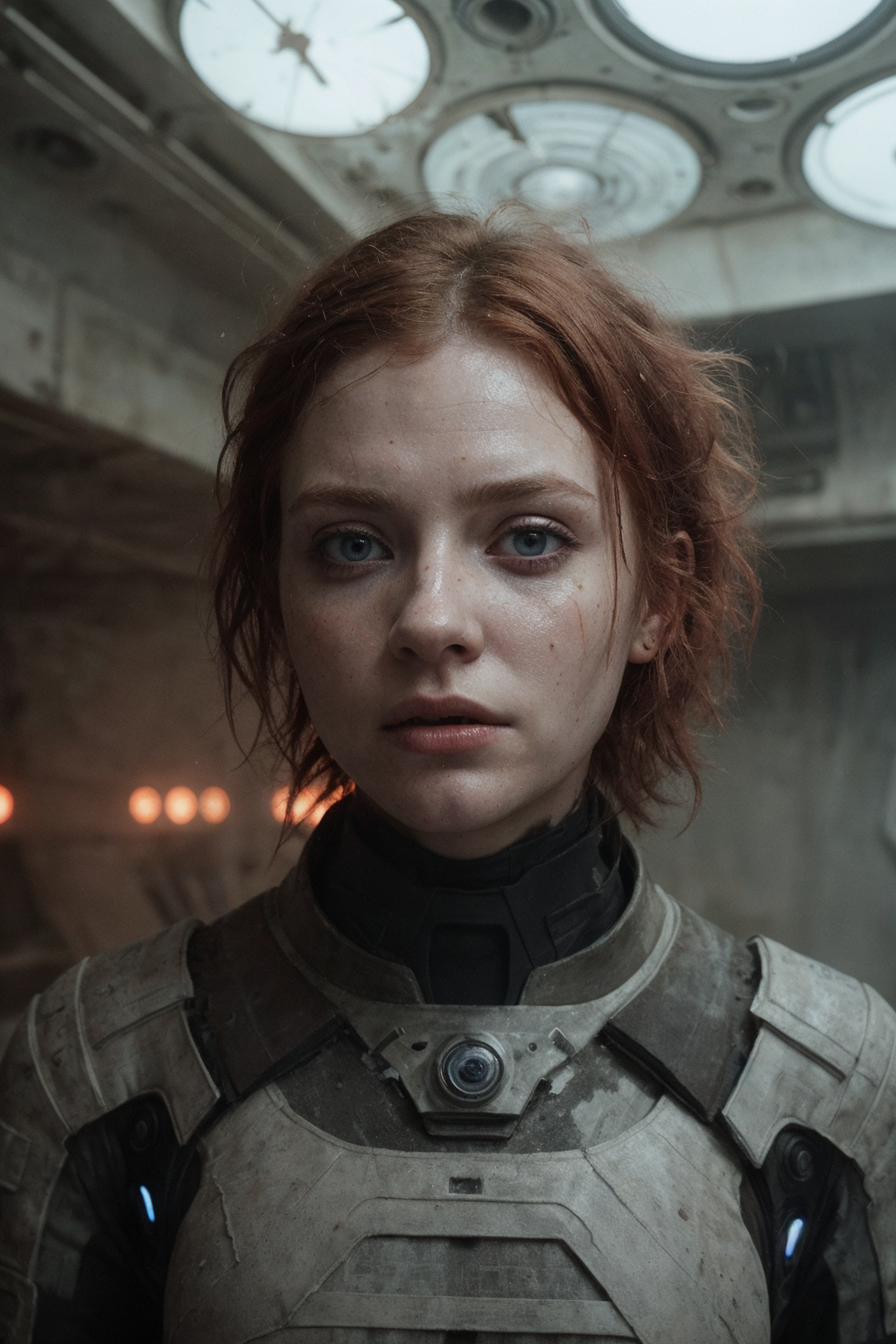 room perspective, cinematic lighting, photo of a ginger woman, in (crashed spaceship:1.2), cracks, scratches,(white futuristic space suit:1.1), (freckles:0.8) cute face, sweaty face, wild hair, (dystopian:1.2), detailed eyes, blue eyes, (dirty face and suit, marks, cracks:1.5), (dark scene:1.1), hard shadows, (frightening, smoke, power failure:1.1), (alarm,alert, red light:1.5), warrior
