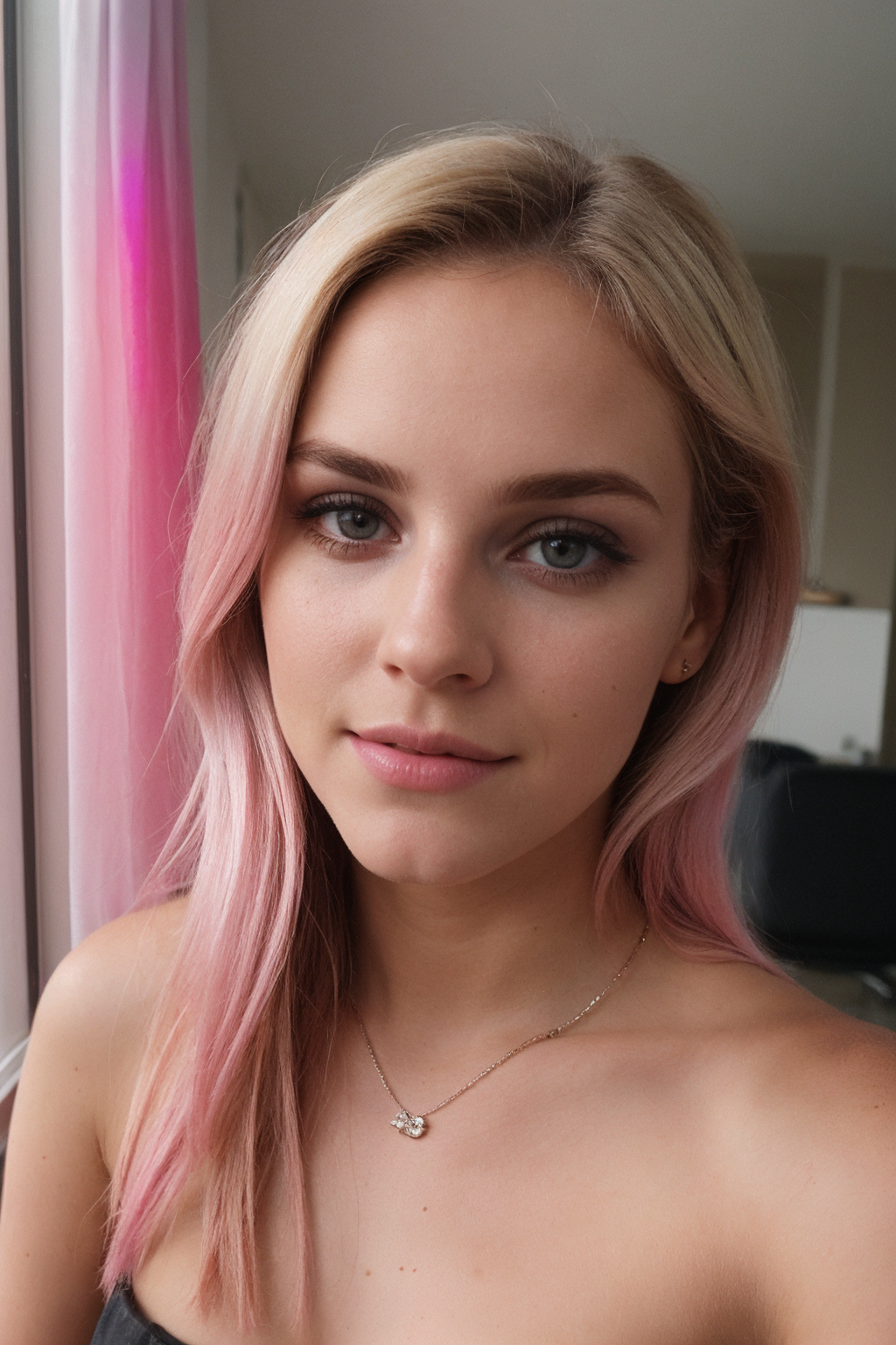 taken with iphone camera BREAK medium shot selfie of a pretty young woman BREAK (ombre:1.3) blonde pink BREAK film grain, medium quality