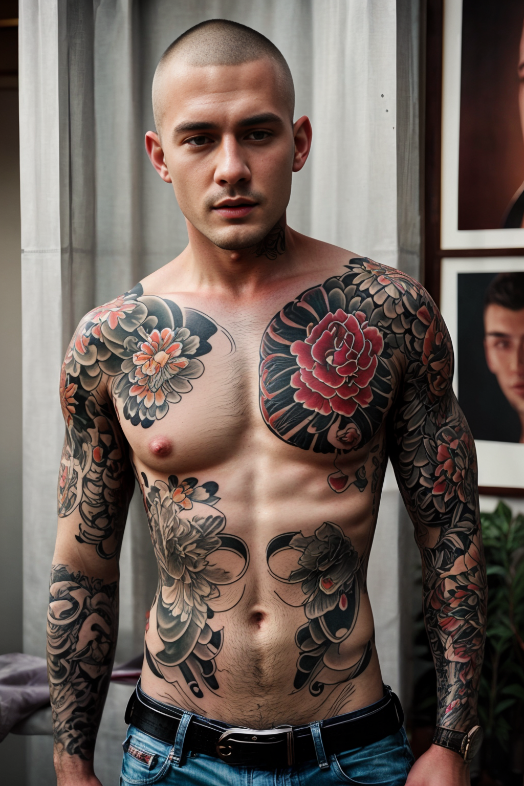 full body and head shot. handsome shirtless fit young adult manly man, detailed face, pale skin, tattoo, irezumi, buzzcut, chest hair, pubic hair, very attractive, incredibly handsome, digital painting, overdetailed digital painting, best quality, soft lighting, <lora:badbroirezumi3:0.75> <lora:add_detail:1.2> <lyco:GoodHands-beta2:1.0>