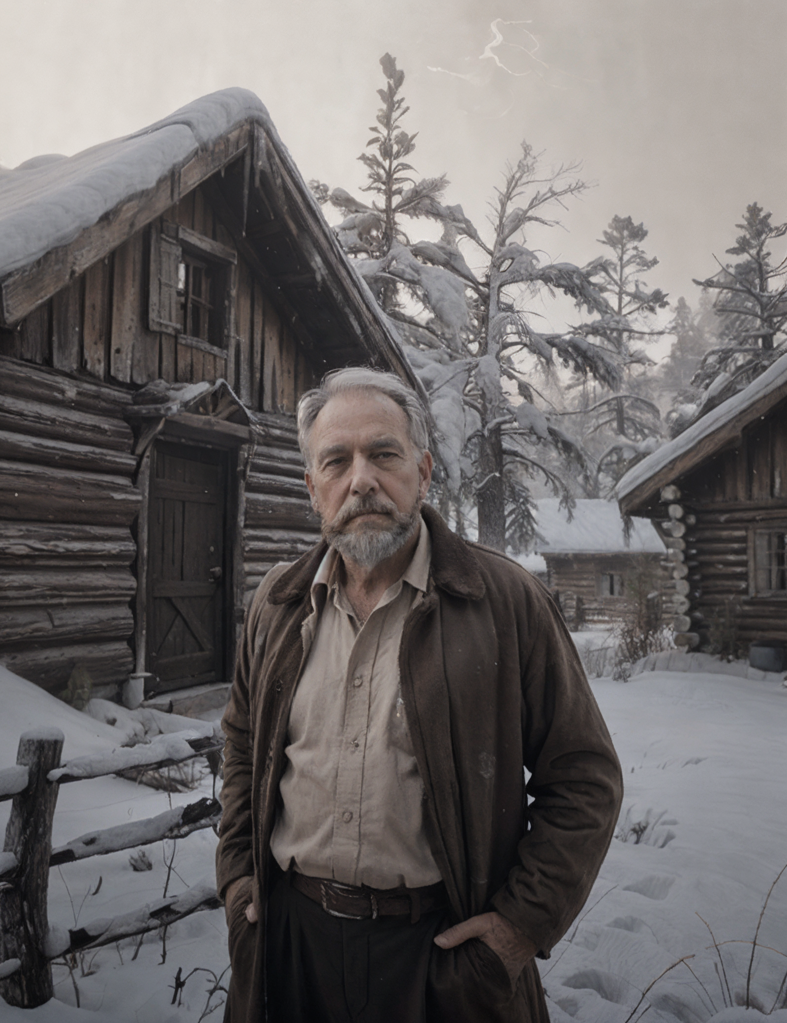 (vintage black and white sepia portrait photo:1.2) of a (old man 80yo:1.2) leaning on a tree, next to a broken fence, dilapidated cabin in the background (place cav_rdrcolter in winter:1.1), (Photograph with film grain, 8K, RAW DSLR photo, f1.2, shallow depth of field, 85mm lens), masterwork, best quality, soft shadow (unkempt beard:1.2), western cowboy outfit, duster coat <lora:AdvancedEnhancer:.8> (soft light, color grading:1.3) <lora:cav_rdrcolter:.7>