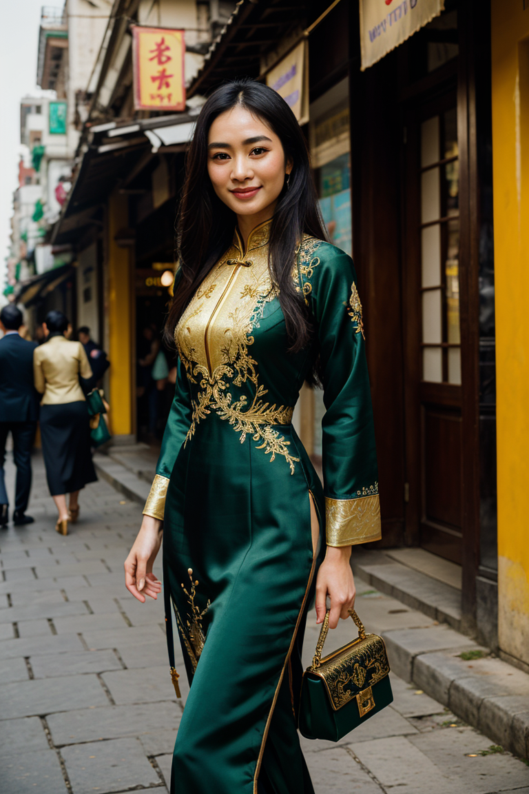 perfect photo photorealism, hyper-realistic, Extremely detailed image, highest quality, masterpiece, UHD, 8k, (Vietnamese girl), (25 years old), (long silky black hair:1.2), (emerald green ao dai with intricate gold embroidery:1.3), (slim figure:1.2), (golden hour:1.2), (detailed face), (Hanoi's Old Quarter:1.2), (lively street scene), (natural sunlight casting soft shadows:1.2), (Leica M10 camera), (Summilux 50mm f/1.4 lens), (Kodak Ektar 100 film), (medium shot), (confident pose:1.1), (smiling gently), (ambient city sounds), (cultural harmony), (soft focus background with clear subject), (vibrant colors)<lora:more_details:1>