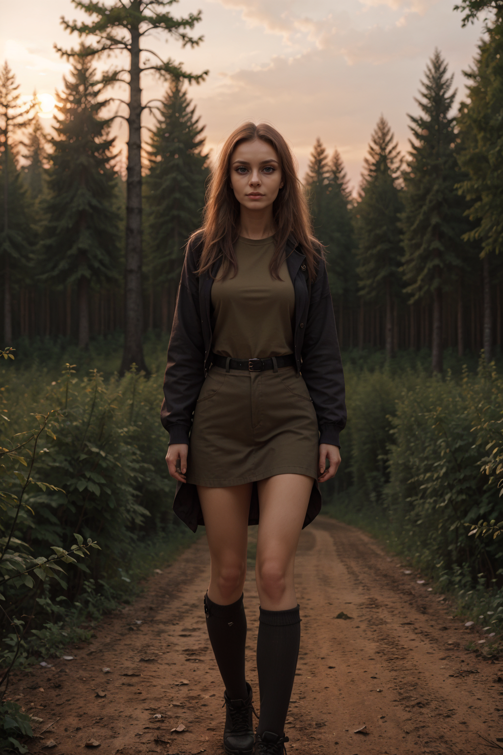 loranever, woman, forest, sunset, <lora:lora_never_smiles:0.8>