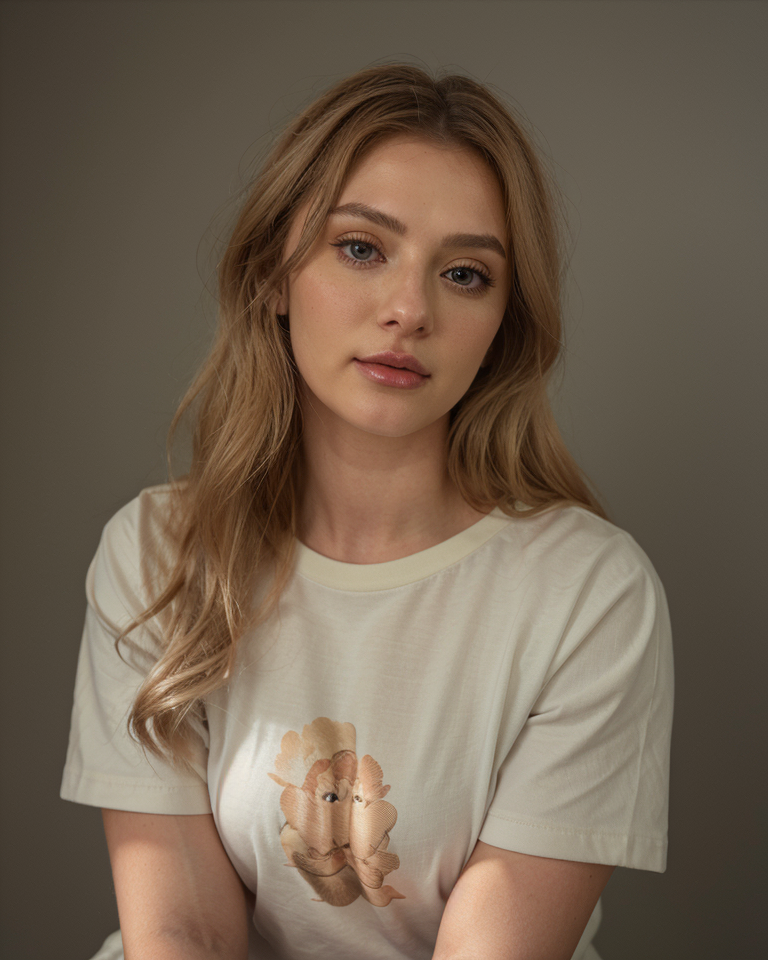 cohenfit, a woman, portrait headshot, blonde hair, floral T-shirt,