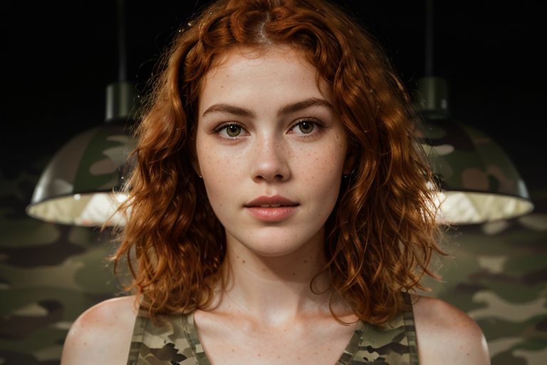 portrait of DEN_heidi_romanova, freckled, (headshot, face focus:1.2), beautiful eyes, detailed face, detailed lips, (plain background:1.2), (Overhead light through a textured surface for interesting shadows (Textured Overhead Light).:1.2), (army uniform camo, camouflage army boots, tank top:1.2), bokeh, f1.4, 40mm, photorealistic, raw, 8k, textured skin, skin pores, intricate details, <lora:epi_noiseoffset2:1>, epiCRealism