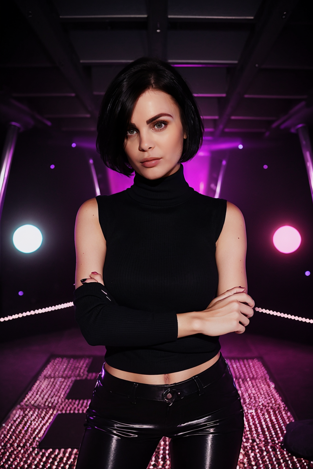 head and shoulders shot, facing the camera, looking straight into camera, wo_emglove01 woman, sfw, short black hair, wearing black tight pants and turtleneck sweater, crossed arms, big knockers, fashion photography, (in a nightclub:1.2), seductive eyes, <lora:woEmglove01:1>