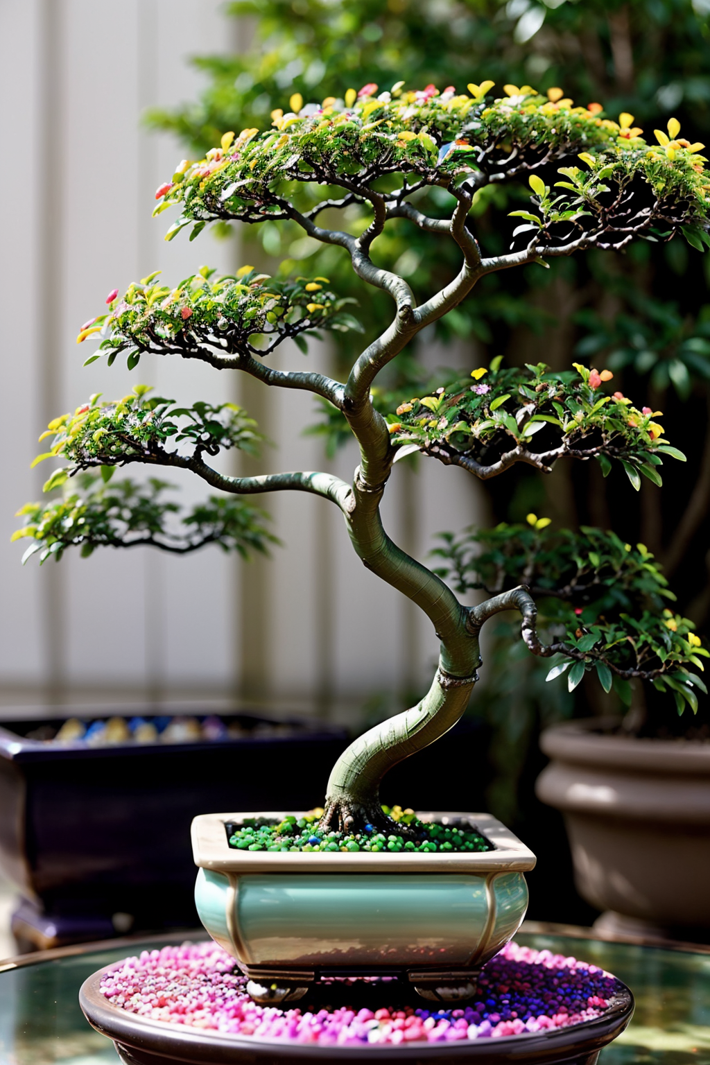 (masterpiece, miniature, vibrant colors:1.2), delicate bonsai tree adorned with precious gemstones, (shimmering with beauty:1.1), (captivating hues:1.2), (intricate embellishments:1.1), (rich and vivid colors:1.2), (compact size:1.1), (whimsical proportions:1.2), (enchanting atmosphere:1.1), a captivating and colorful miniature treasure. <lora:add_detail:0.75> <lyco:GoodHands-beta2:0.75>