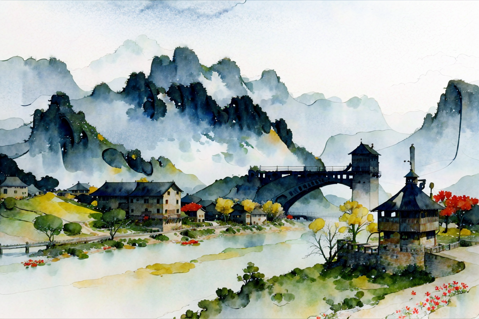 a wild, with mountains, a stone house with mill, trees, flower fields, river, modern setting, ((watercolor painting)), digital illustration, masterpiece, best quality, fullcolor, approaching perfection, intricate details, highly detailed, concept art, smooth, sharp focus, <lora:InkIsEverythingV1:0.7>,
