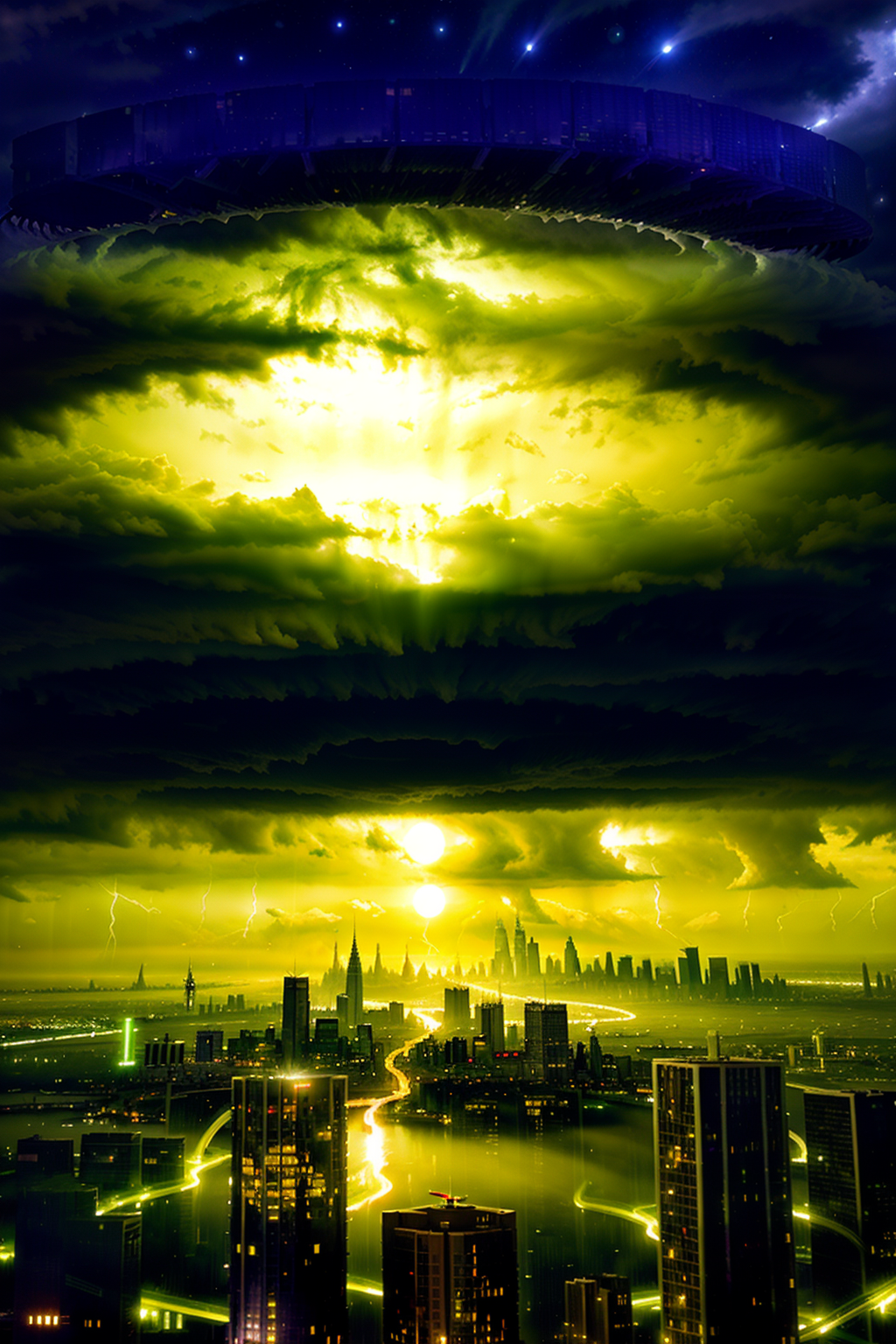 outdoors, sky, cloud, water, tree, no humans, night, moon, cloudy sky, fire, building, nature, night sky, scenery, full moon, smoke, science fiction, city, fantasy, light, cityscape, bridge, skyscraper, lightning, tower, landscape, city lights, lights