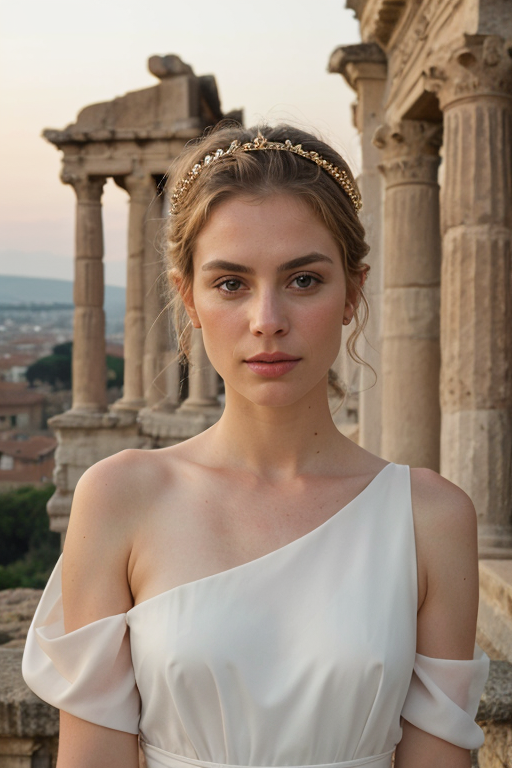 (High detail RAW Photo), a cinematic photograph of the most beautiful goddes in Rome wearing a white toga, crown, in an ancient rome setting, a (pale:1.2) (blonde:1.3) mature woman in a white dress and gold accessories (masterpiece, extremely detailed skin, photorealistic), sharp focus, film grain, grainy, cinematic, detailed face, detailed skin, warm color, mist, greek temple, daylights, beautiful face,(upper body:1.1), depth of field, sensual pose, ancient style, on top of the mountain, sunset, (ancient town in background:1.2), imperfect skin