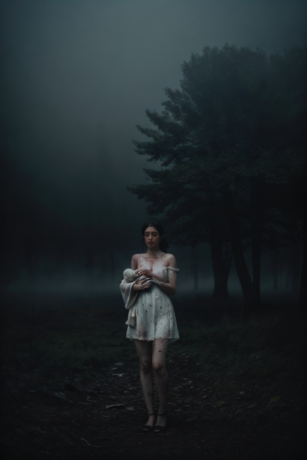 photo realistic, masterpiece, best quality, a beautiful girl in open shoulders, white ghostly open shoulder dress, blood spatter, blood splatter, bloody dress, soaked in blood, holding a bloody doll, creepy toy doll, covered in fog, misty forest, Surrealism. Dreamy dim daylight. Minimalism, emptiness, spaciousness. Dark theme, dark shot, creepy lighting from below, film grain, horror photography, misty and foggy atmosphere, full body, <lora:epiCRealismHelper:1>