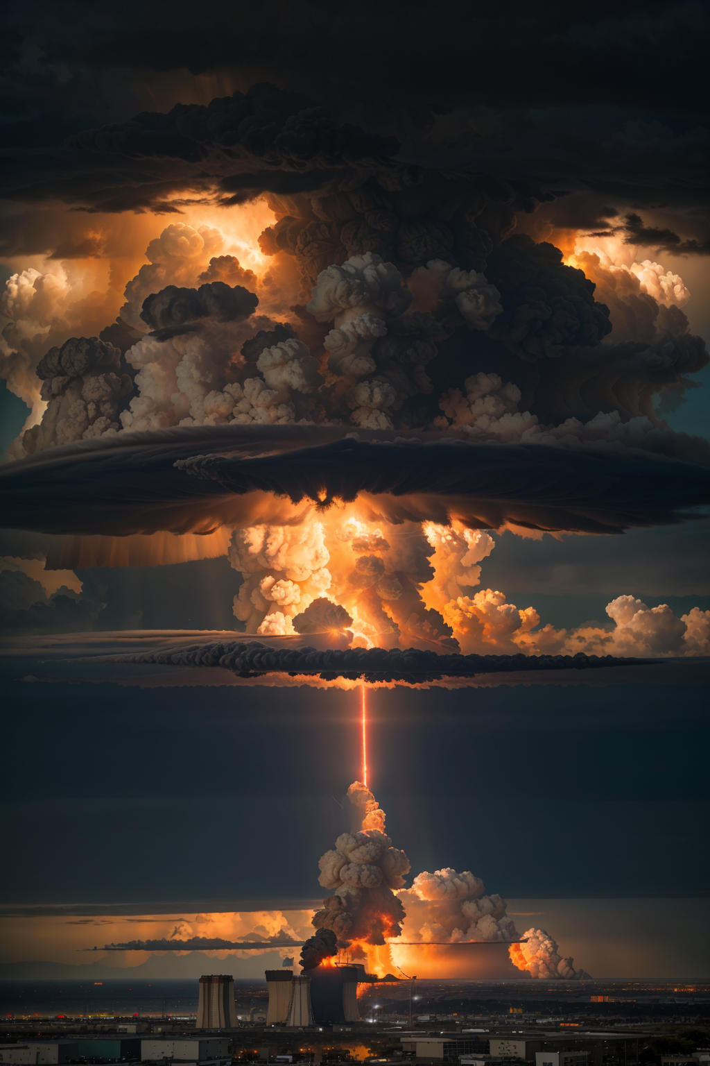Raw photo of huge Atomic explosion, crepuscular rays, cumulus nimbus clouds, volcanic lightning, 8k uhd, dslr, high quality, film grain, Fujifilm XT3,fireball, (nuclear weapon:1.2),Mushroom cloud,Distant city,,Radiation,(Surface reflection,ocean:1.2),