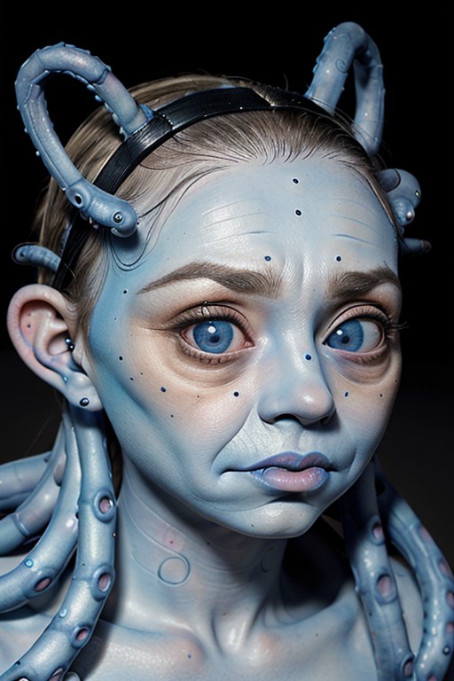 A alien, (extremely big eyes:1.4), skinhead, (small ears:1.2), (small nose:1.2), wide mouth, (shed blue skin:1.5), (tentacles on head:1.2), black face tattoo, 8k raw, uhd