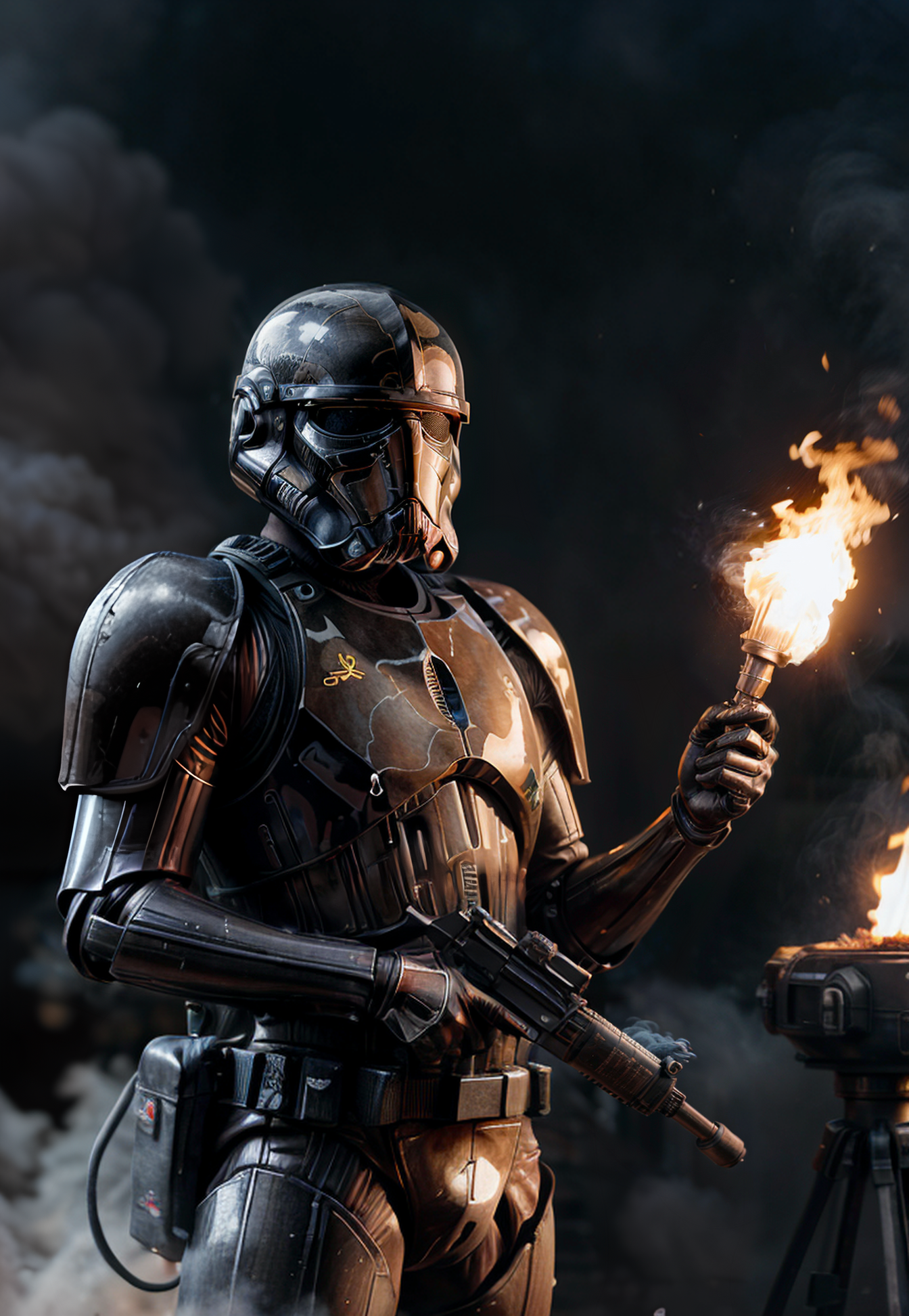 masterpiece, best quality, high res, best quality, pthe greatest details, 8k, UHD, HDR, fire and smoke, 1man, epic, <lora:add_detail:1>, <lora:ng_deepnegative_v1_75t:1>, <lora:RealDownblouse15_v2.08:1>,<lora:DtrooperV01:1> deathtrooper suit, man in deathtrooper, Fujifilm XT3,