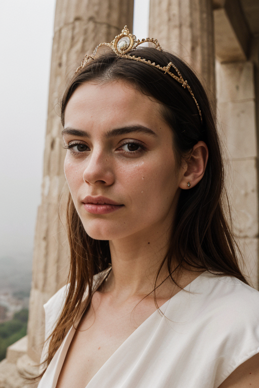 (High detail RAW Photo), a cinematic photograph of the most beautiful goddes in Rome wearing a white toga, crown, in an ancient rome setting, a crying woman in a white dress and gold accessories (masterpiece, extremely detailed skin, photorealistic), sharp focus, film grain, grainy, cinematic, detailed face, detailed skin, warm color, mist, greek temple, daylights, beautiful face,(upper body:1.1), depth of field, sensual pose, ancient style, on top of the mountain, mist, fog, ancient town in background, tears on face