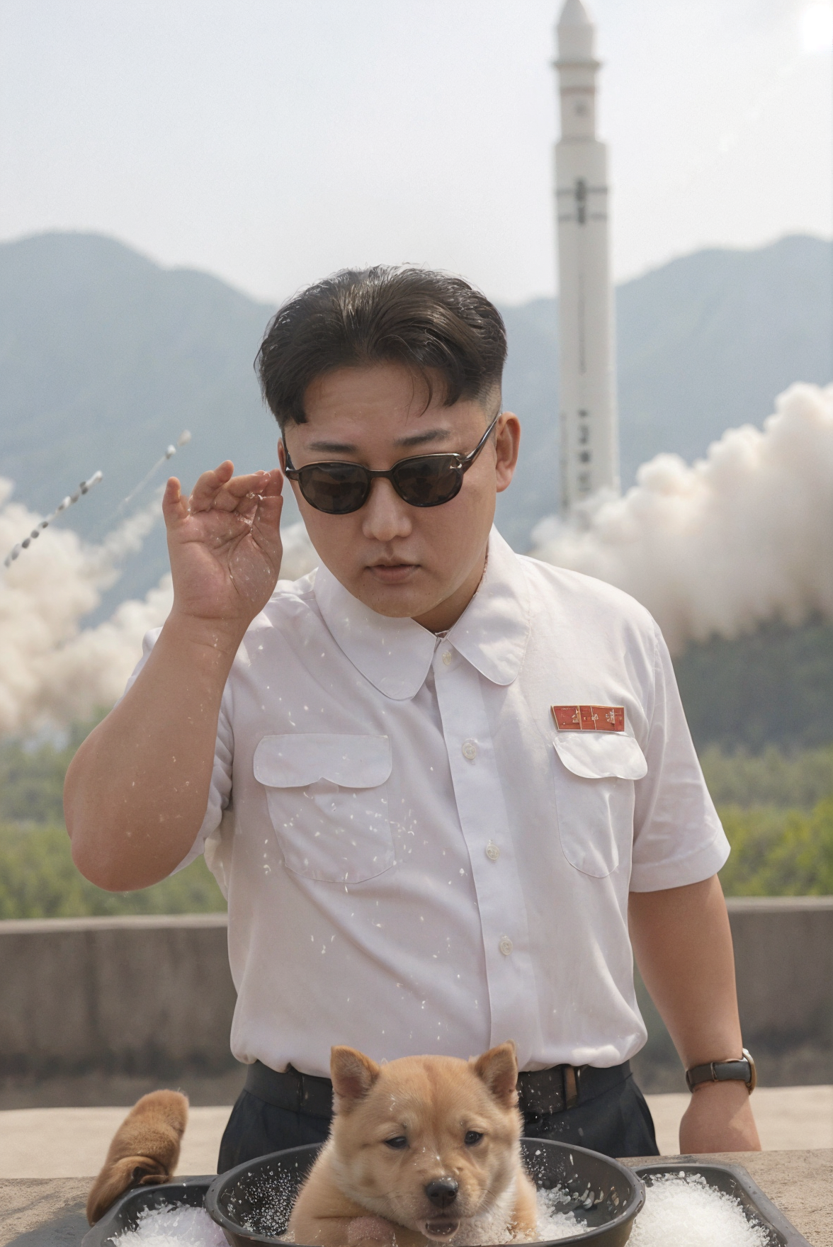 a man (jimkong) wearing (sunglases) sprinkling salt (SaltBaeMeme:1.2) onto a (cute puppy on a dish) outdoor. (backdrop of rockets and missles firing:1.3). <lyco:KimJongUnDogu:0.69>, <lora:SaltBaeMeme:0.9>
