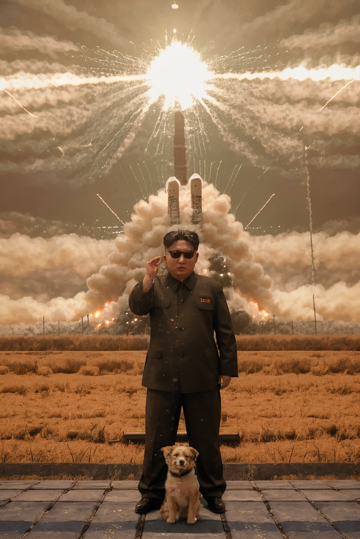 a man (jimkong) wearing (sunglases) sprinkling salt (SaltBaeMeme:1.2) onto a (cute puppy on a dish) outdoor. (backdrop of rockets and missles firing and fire and explosions:1.5). <lyco:KimJongUnDogu:0.69>, <lora:SaltBaeMeme:0.9>