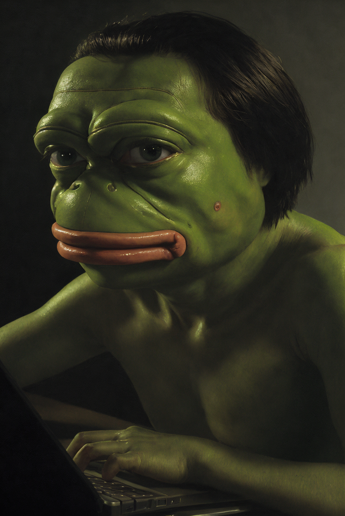 Portrait of ((((pepe_frog)))) <lora:epi_noiseoffset2:0.5> in a ((suit)) typing on a laptop, (((green skin))) BREAK magazine cover, BREAK (masterpiece, extremely detailed skin, photorealistic, heavy shadow, dramatic and cinematic lighting, key light, fill light), sharp focus, BREAK, <lora:pepe_frog_v2:1>, epicrealism
