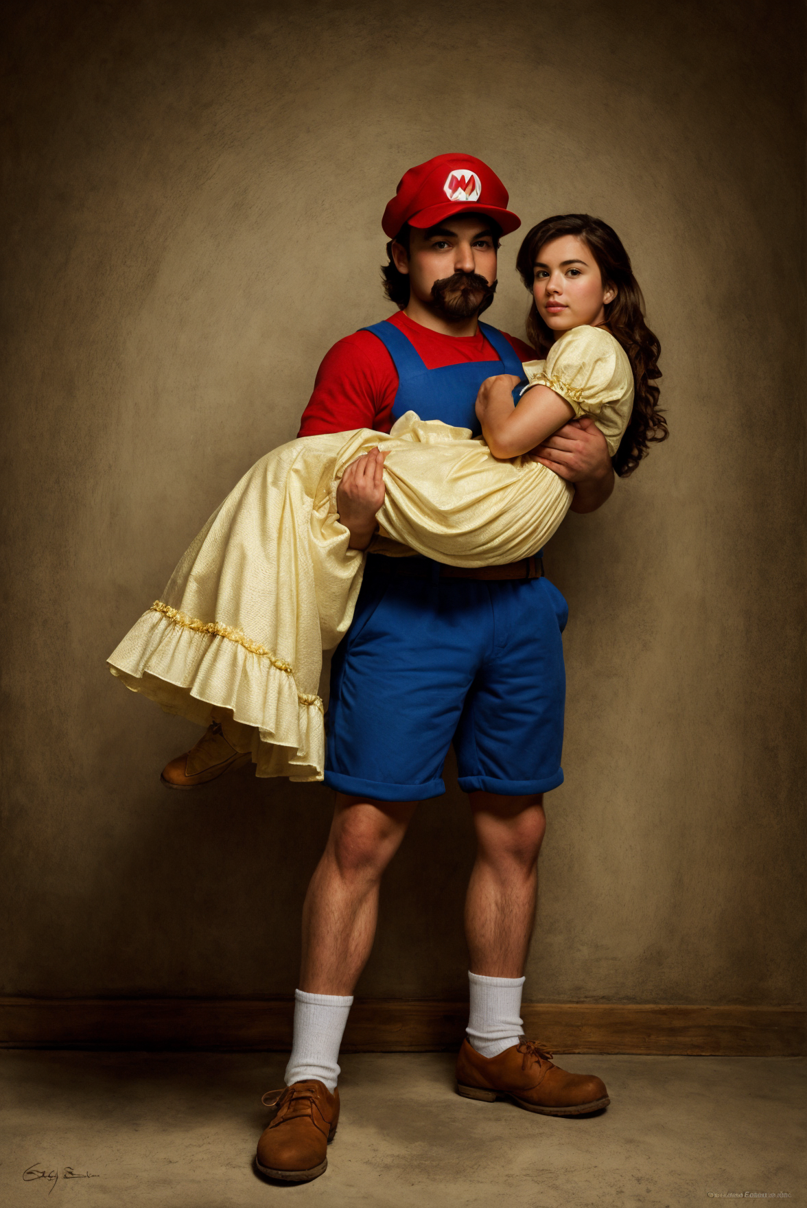 real life super mario carrying the princess, princess carry, <lora:princess_carry_v0.1:1>, masterpiece, best quality, highly detailed