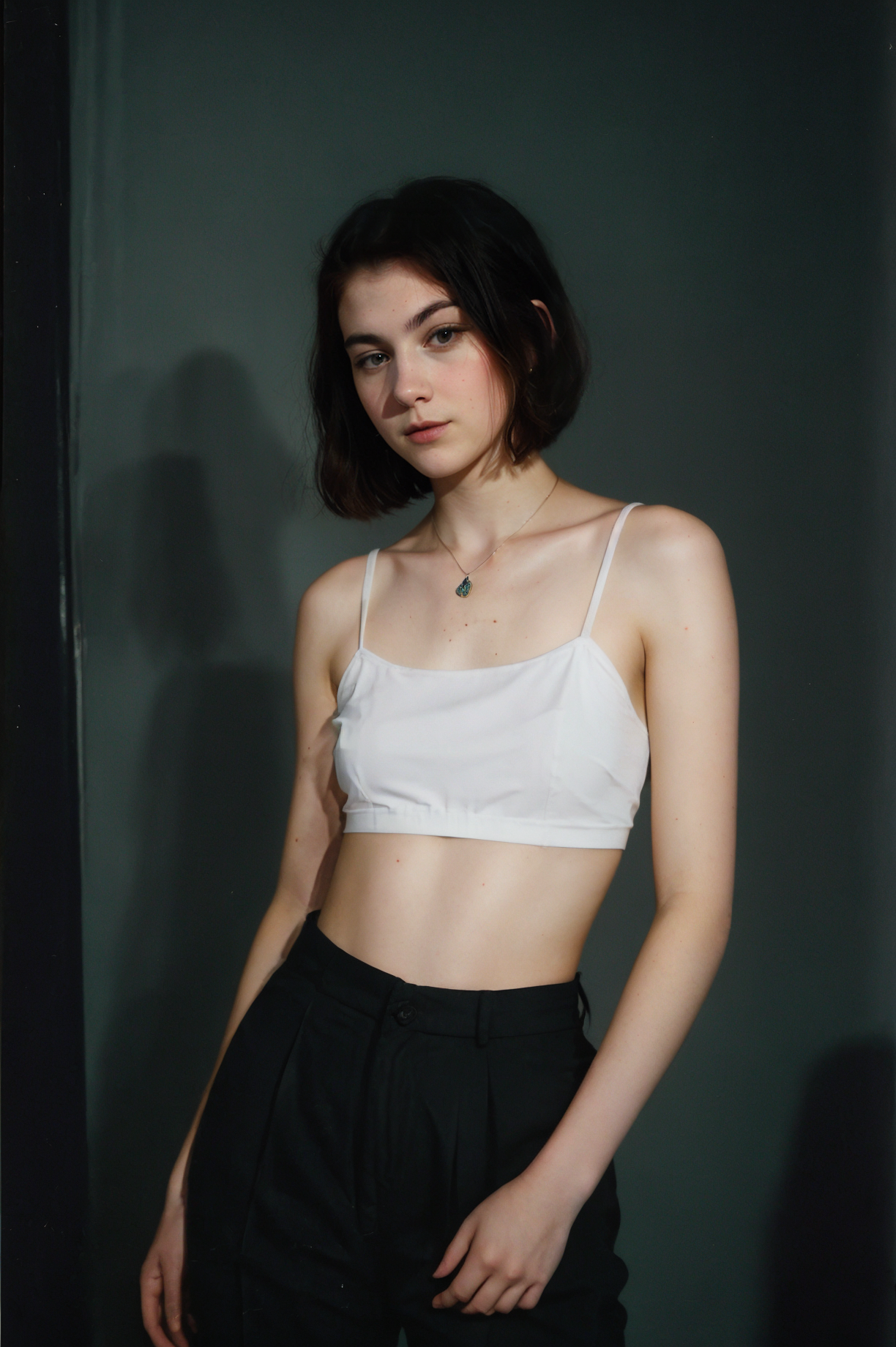 (closeup) Portrait of pretty young (18-year-old) pale milky white skin Caucasian (futuraaurora9600v5) ((Standing with one foot pointed, hands on hips, highlighting grace and poise.:1.07)), (flat chest:1.15), outdoor, BREAK blonde Chic Bob: A sleek and angled bob hairstyle that exudes modern elegance., no makeup, long dainty necklace,(( Mint green pleated camisole with tailored trousers.)) , <lora:epi_noiseoffset2:1> BREAK (magazine cover:1.10), BREAK (masterpiece, extremely detailed skin, photorealistic, heavy shadow, dramatic and cinematic lighting, key light, fill light), sharp focus, BREAK location is (outdoor Florence, Italy), <lora:InstantPhotoX3:0.7>