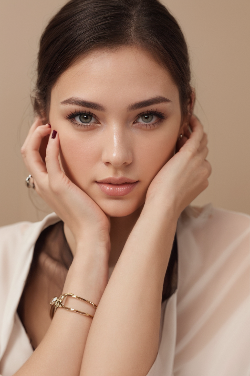 girl, close-up, looking at viewer, wispy swept bangs, hand on own cheek, portrait, ((sleevless blouse, shawl)), bracelet, pastel manicure, thick eyebrows, simple background, super model, fashion model, parted lips, (High Key Lighting, makeup), blush, rouge \(makeup\), masterpiece, top quality, best quality, official art, unity 8k wallpaper, highres, ultra-high res, ultra-detailed, beautiful and aesthetic,