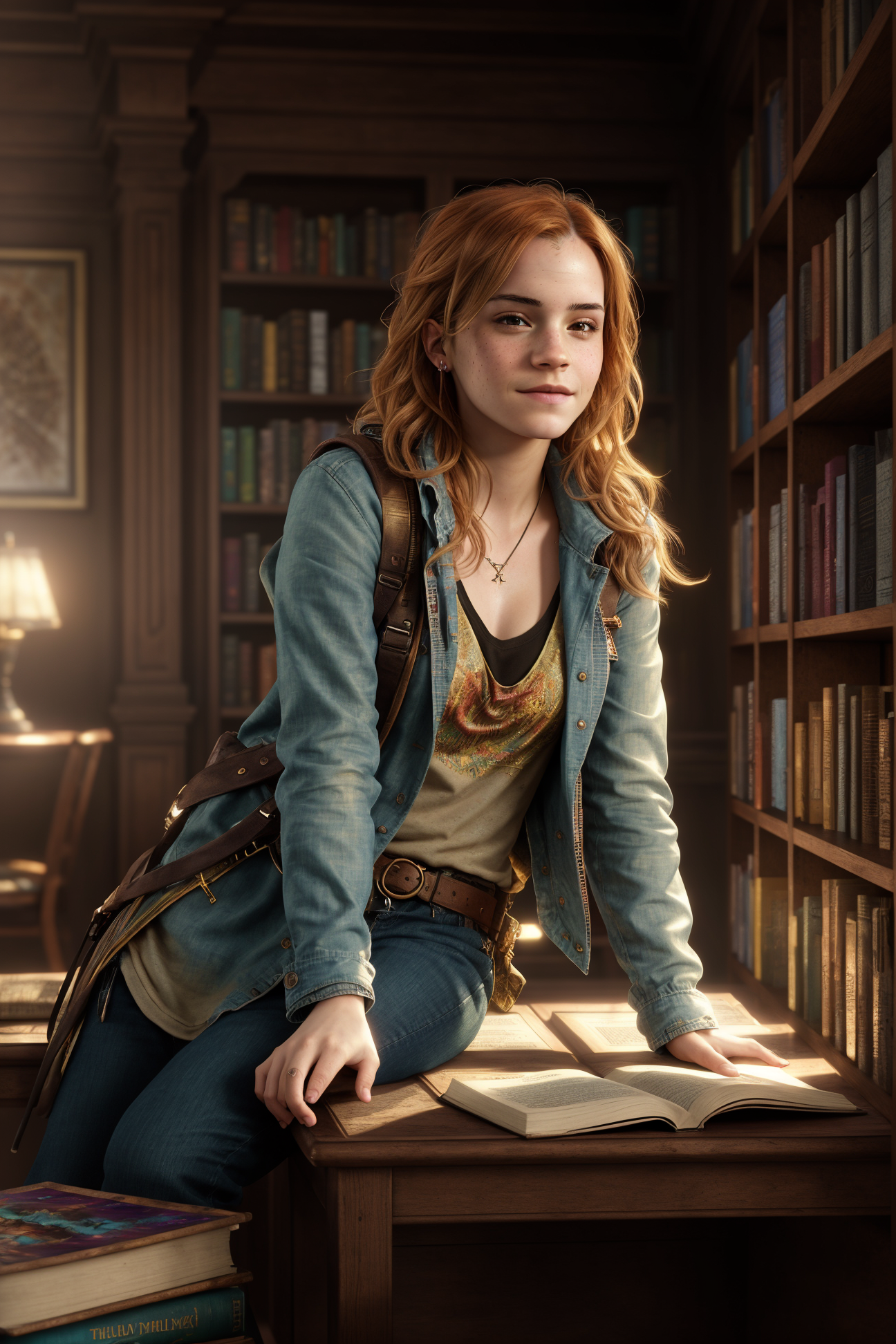 Hermione_Granger_Emma_Watson-4400, a woman, smile in face, sitting, happy, golden hair, curley, small amount of freckle, pretty, in library, books, detailed, hdr, epic background, line art, digital illustration, comic style, dynamic, highly detailed, artstation, concept art, smooth, sharp focus, illustration, Thomas Moran style, art by Carne Griffiths and Wadim Kashin, detailed background, 60-30-10 color rule, warm tones, godrays, unreal engine, greg rutkowski, loish, rhads, beeple, makoto shinkai and lois van baarle, ilya kuvshinov, rossdraws, tom bagshaw, alphonse mucha, global illumination, detailed and intricate environment