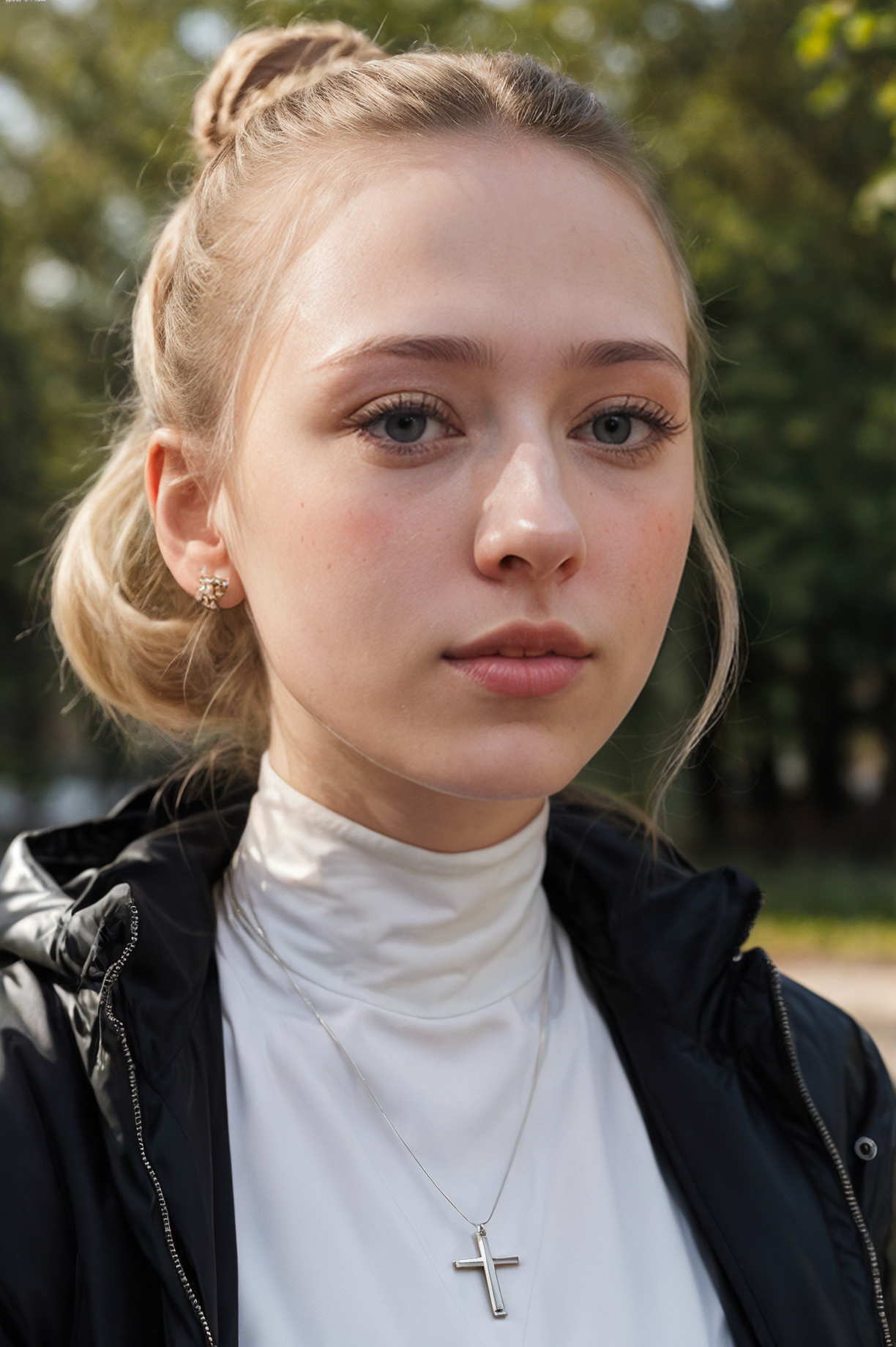 (closeup faceshot:1.4) Portrait of pretty young (18-year-old)white skin Caucasian (futurapristine4675v5) ((Gazing upwards, showcasing vulnerability and allure.:1.07)), (flat chest:1.15), outdoor, BREAK (white space buns), no makeup, long dainty necklace, ((high neck top and big puffer jacket)) , <lora:epi_noiseoffset2:1> BREAK (magazine cover:1.10), BREAK (masterpiece, extremely detailed skin, photorealistic, heavy shadow, dramatic and cinematic lighting, key light, fill light), sharp focus, BREAK location is (outdoor Moscow, Russia), <lora:ClothingAdjuster3:-0.5>