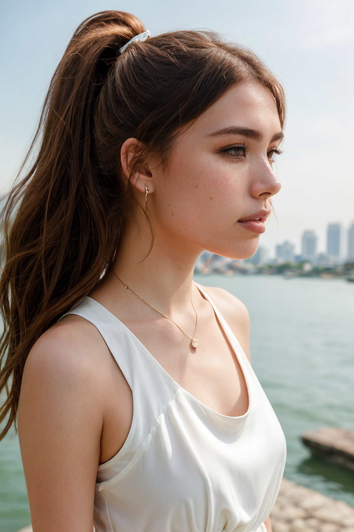 futuramadison9775v5, Portrait of pretty young (18-year-old) pale milky white skin Caucasian woman ((body slightly turned, showcasing a strong and alluring profile.:1.07)), outdoor, BREAK (ginger Textured high ponytail: A high ponytail with textured and tousled strands, giving a modern and edgy twist to a classic style.), no makeup, long dainty necklace, ((classy and elegant The Sensational Silk: This romper is made of flowing silk fabric, featuring a deep V-neckline and a sensual appeal.)) , <lora:epi_noiseoffset2:1> BREAK (magazine cover:1.10), BREAK (masterpiece, extremely detailed skin, photorealistic, heavy shadow, dramatic and cinematic lighting, key light, fill light), sharp focus, BREAK location is (outdoor Bangkok, Thailand), <lora:ClothingAdjuster3:-0.5>