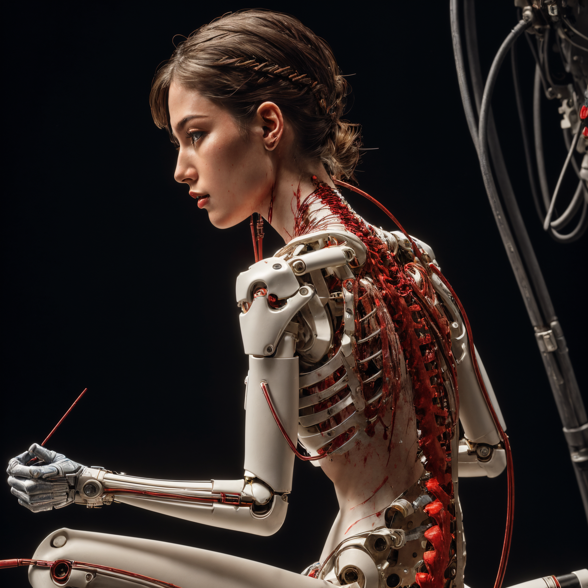 (masterpiece, epic quality, ultra detailed, beautiful and aesthetic:1.2), a mechanical girl,colorful, face, ((an extremely delicate)), (from side), cinematic light,solo,full body,(machine made joints:1.2),((mechanical limbs)),(blood vessels connected to tubes),(mechanical vertebra attaching to back),((mechanical cervial attaching to neck)),(sitting),expressionless,(wires and cables attaching to neck:1.2),(wires and cables on head:1.2)(character focus),science fiction,white background,(blood:1.4), 8K RAW photo