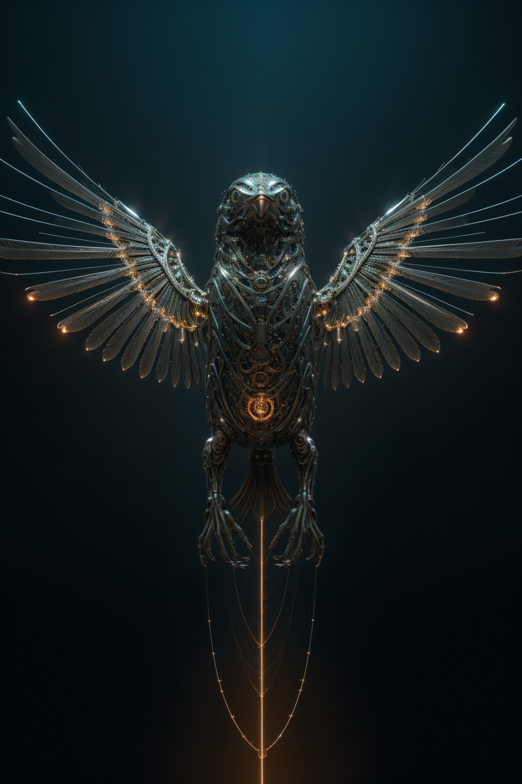 RAW Photo, Mechanical Bird, night sky, flying, (glowing particles:1.2), global illumination, metal, ornaments detailed, cold colors, intricate details, glowing eyes, neon details, machanical limbs, blood vessels connected to tubes, <lora:MechanicalBird:0.5>