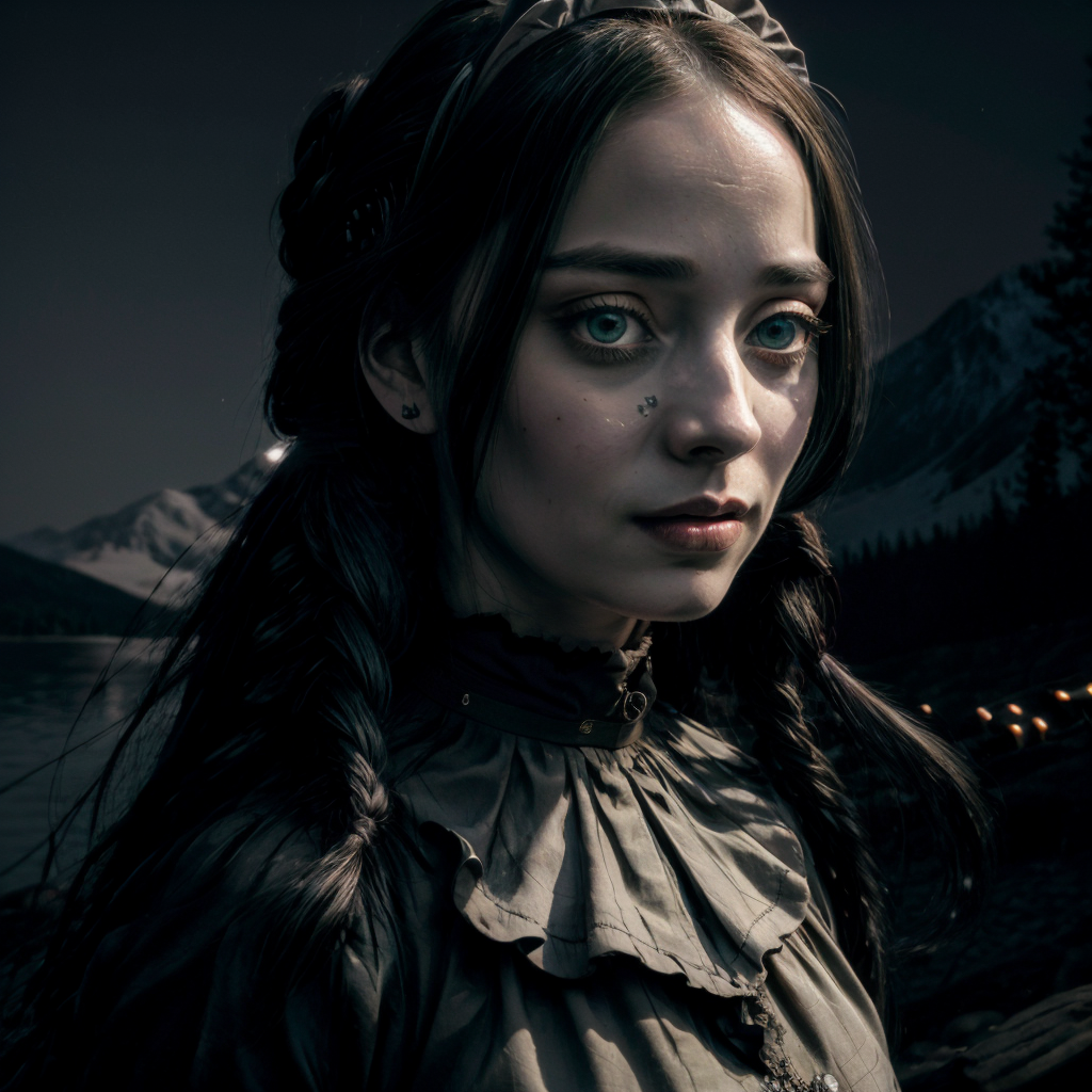 (AS-Adult:1),(masterpiece:1.2), best quality, {Masterpiece}, High Quality, best quality, ultra detailed, absurdres, highres, original, extremely detailed wallpaper, 8K, (best illustration), (best shadow), <lora:Giselle1:0.9>, 1girl, solo, long hair, close, green eyes, maid outfit, braids, (((night:1.3))), <lora:Beautifuleyes:0.7>, beautiful eyes, <lora:Adddetail:0.6>, add_detail,lake, mountains, forest, dirt road
