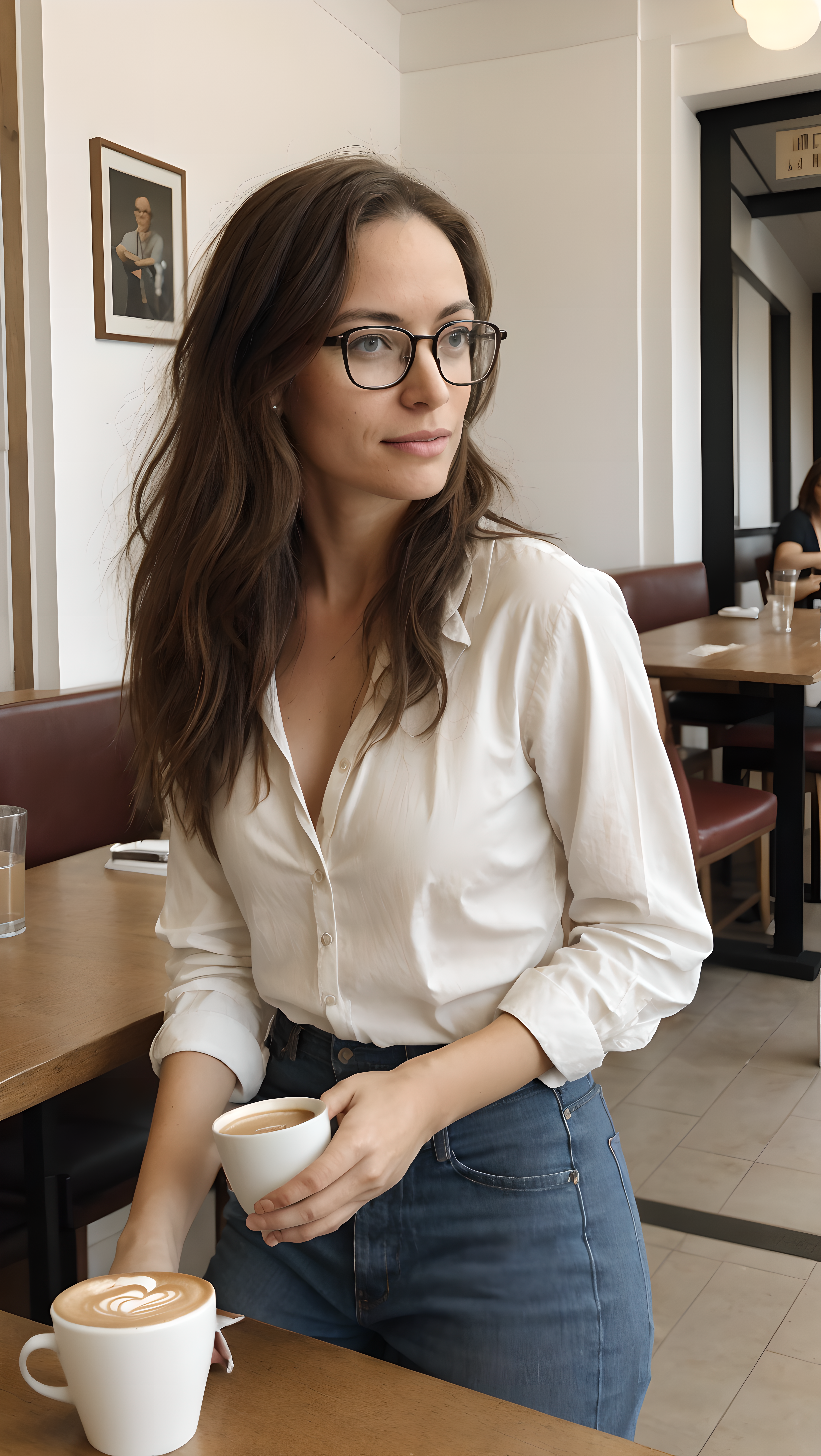 [ (art by Roberto Ferri:1.1) ,art by Vanessa Beecroft:16], photograph, elegant, Street level shot of a Macho Wife wearing plain clothing, glasses, nerdy, geeky, drinking a coffee in a small cafe, chill, messy hair, at Midday, Ultra Real, film grain, Iphone X, F/2.8, Vibrant Color