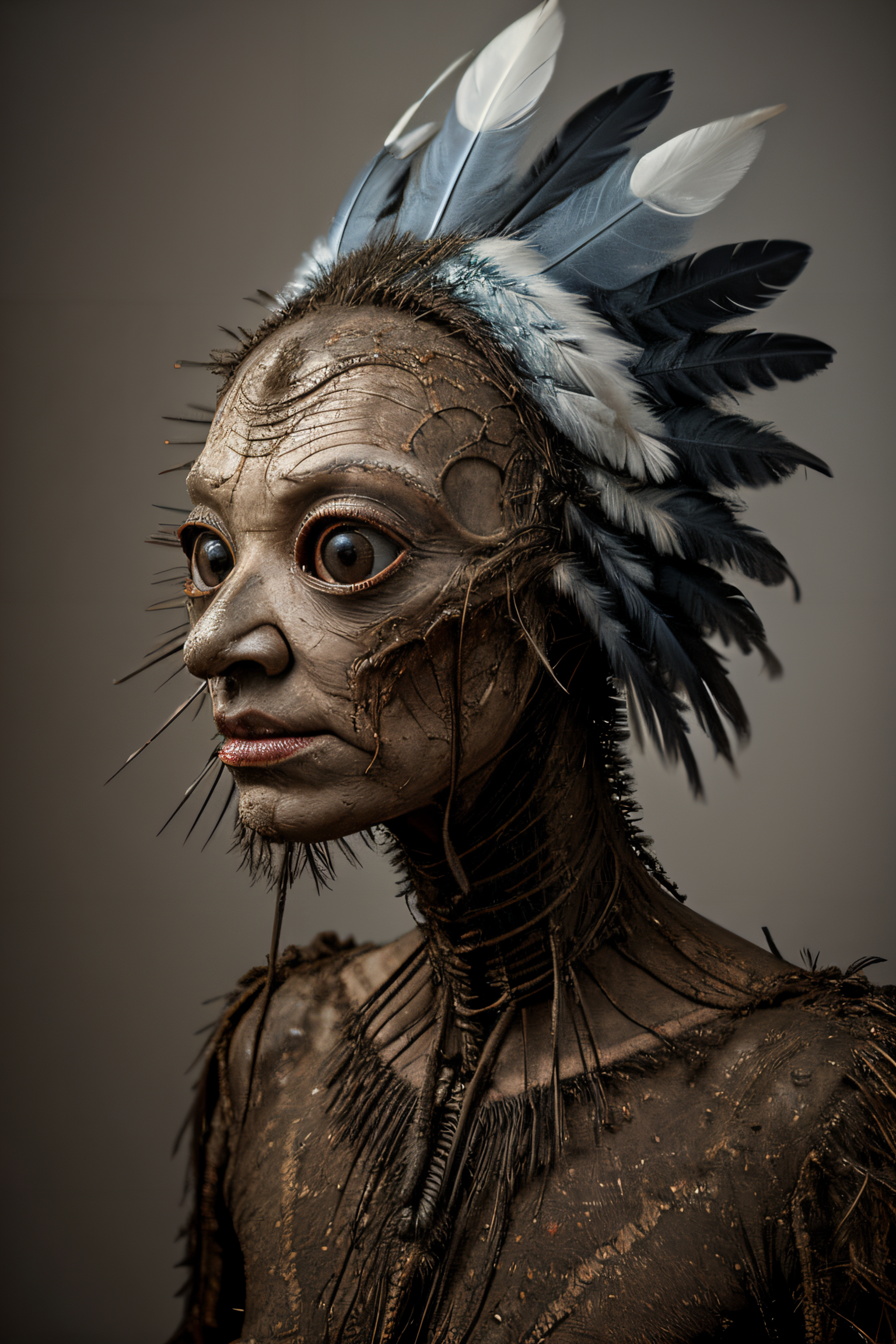 a creepy crane head creature in a helmet with (rolling feathers:1.2), grotesque, horror, rotting skin, rust, steel