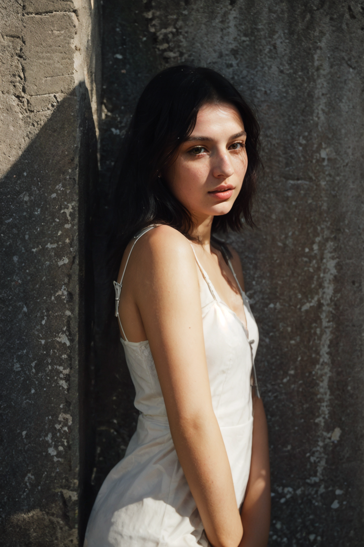 futuraalice14120v5, Portrait of pretty young (18-year-old) pale milky white skin Caucasian woman ((Leaning against a wall, one leg crossed over the other, showcasing elegance.:1.07)), (flat chest:1.15), outdoor, BREAK (blonde Sleek and shiny straight bob: A short, straight bob with a glossy finish, exuding a sleek and polished vibe that's perfect for the high-class woman on the go.), no makeup, long dainty necklace, ((Black satin slip dress with deep V-neckline and side slit - sleek and seductive.)) , <lora:epi_noiseoffset2:1> BREAK (magazine cover:1.10), BREAK (masterpiece, extremely detailed skin, photorealistic, heavy shadow, dramatic and cinematic lighting, key light, fill light), sharp focus, BREAK location is (outdoor Torres del Paine National Park, Chile), <lora:InstantPhotoX3:0.7>, <lora:ClothingAdjuster3:-0.7>