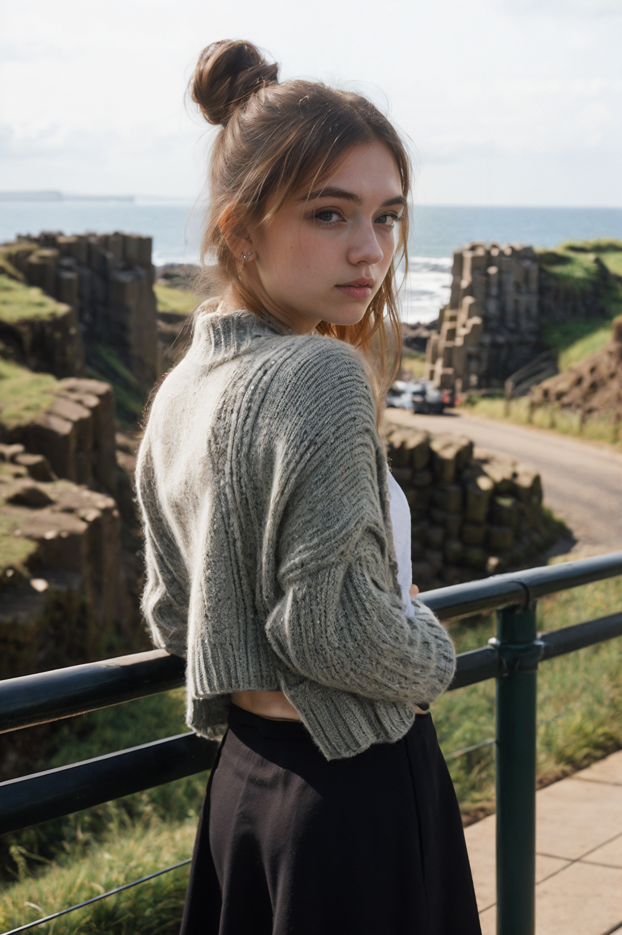 futuraalex20600v52, (closeup) Portrait of pretty young (18-year-old) pale milky white skin Caucasian woman ((Leaning against a railing, legs crossed, with a seductive glance back over the shoulder.:1.07)), outdoor, BREAK (ginger Effortless messy bun: A casual and tousled bun, giving an effortless yet chic vibe that is perfect for high-class events.), no makeup, long dainty necklace, (((classy and elegant:1.05) Ribbed knit cardigan with a silk midi skirt.)) , <lora:epi_noiseoffset2:1> BREAK (magazine cover:1.05), BREAK (masterpiece, extremely detailed skin, photorealistic, heavy shadow, dramatic and cinematic lighting, key light, fill light), sharp focus, BREAK location is (outdoor Giant's Causeway, Northern Ireland), <lora:InstantPhotoX3:0.4>,, <lora:ClothingAdjuster3:-0.7>
