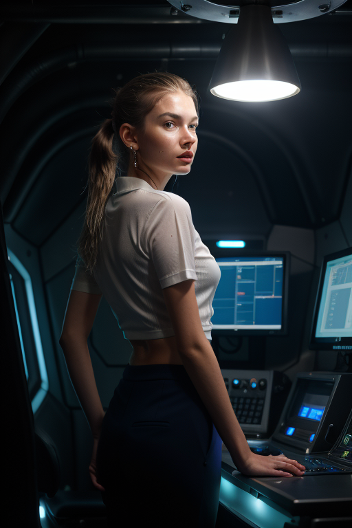 A cinematic shot of a slender 20 yo woman scientist with natural lips seen from behind, looking up at the viewer, engrossed in her cozy spaceship cabin. wearing a futuristic navy armour short sleeve suite. flirting with the camera, blurry. short silver hair, ponytail, sweat bang on hair, (blue:1.1) eyes, sweat on a skin with drops of sweat dripping from the temples, spaceship environment, computers, test tubes. bright blue earrings, detailed skin and face, rim light, warm soft lighting, <lora:LowRA:0.2>, <lora:ClothingAdjuster2:0.2>