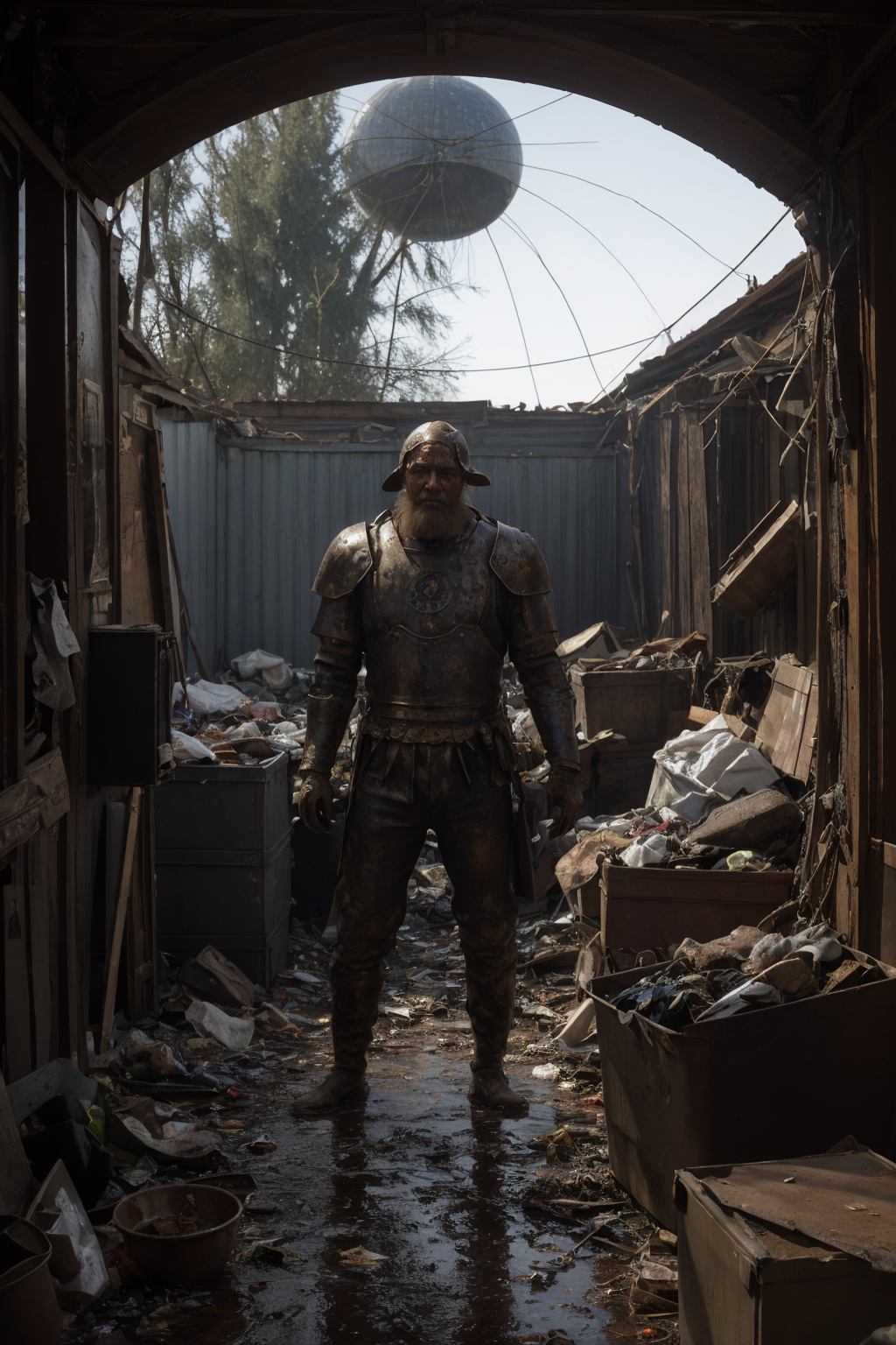 photo of an Old man with wrinkly skin, (large Metal dome like bowl on head:1.2), facing camera, full body, messy long beard, highly detailed, (improvised homemade rusty metal armor:1.1), greasy, dirty skin, solo, (outdoors:1.2), dynamic pose, messy hair, clutter, (Clutter-Home:1.0), grime, trash, dirty, gritty, photorealistic, masterpiece, best quality, surreal,<lora:epi_noiseoffset2:0.6>, (8K, UHD:1.2), (photorealistic:1.2), <lora:LowRA:0.25> ,