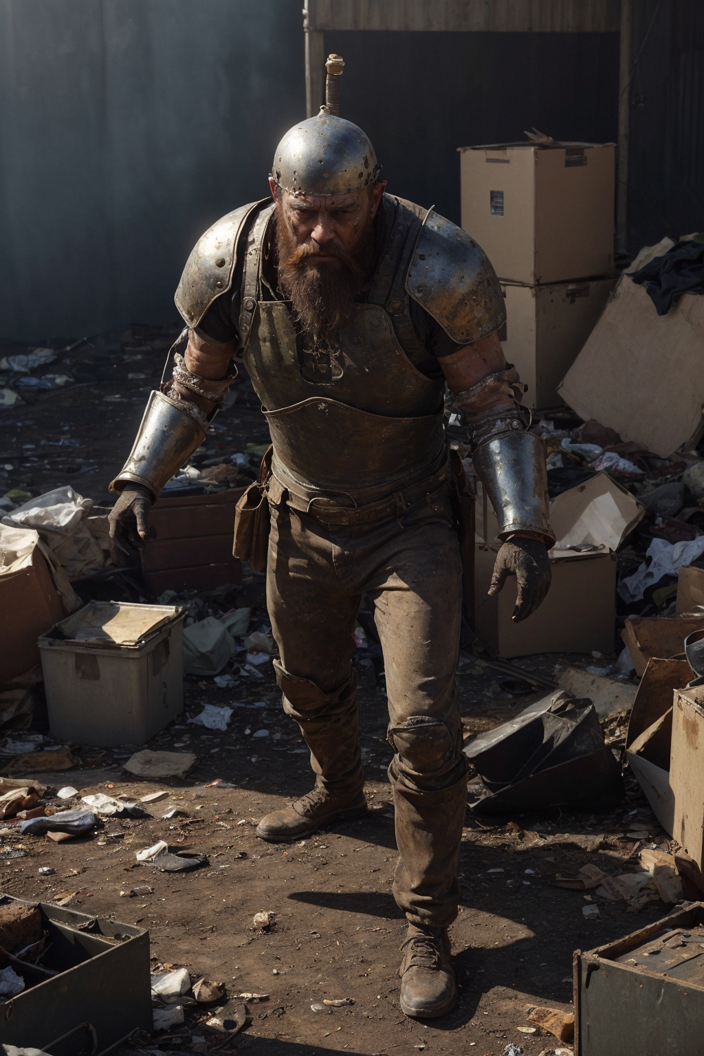 photo of an Old man with wrinkly skin, (large Metal dome like bowl on head:1.2), facing camera, full body, messy long beard, highly detailed, (improvised homemade rusty metal armor:1.1), greasy, dirty skin, solo, (outdoors:1.2), dynamic pose, messy hair, clutter, (Clutter-Home:1.0), grime, trash, dirty, gritty, photorealistic, masterpiece, best quality, surreal,<lora:epi_noiseoffset2:0.6>, (8K, UHD:1.2), (photorealistic:1.2), <lora:LowRA:0.25> ,
