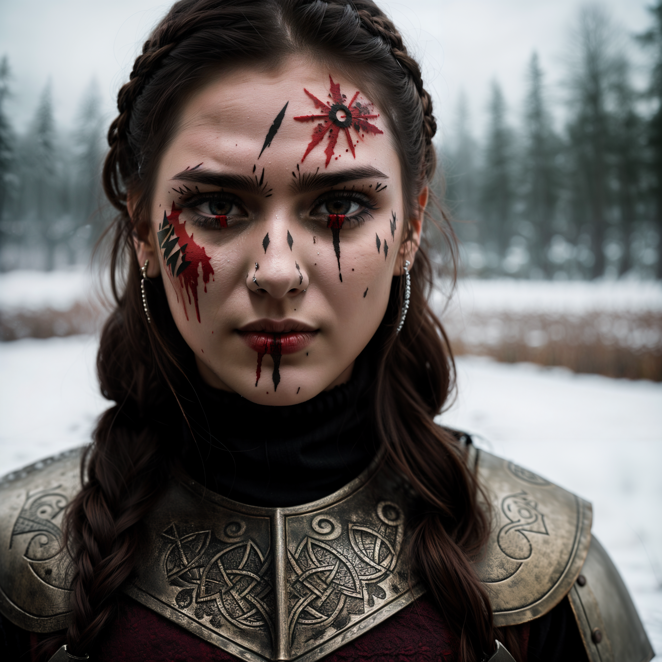 (masterpiece, epic quality, epic detail, epic realism, 4K), a portrait photo of the viking shieldmaiden in battle, intricate details, (winter, snow, forrest:1.2), (braided hair:1.1), (old used leather and dirty metal armor with some rusty spots:1), (viking armor decorations:1.2), (high detailed skin:1.2), full sharp, detailed face, fiercy look, (tattoos, scars, blood on the face:1.1), soft lighting, sharp focus, (beautiful dark eyes:1.4), A gloomy and harsh scene, hdr