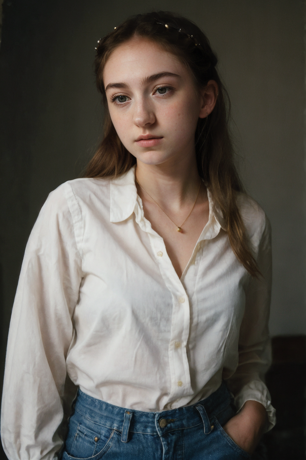 (closeup) Portrait of pretty young (18-year-old) pale milky white skin Caucasian (futurasienna5000v5) ((Leaning forward, projecting strength and sensuality.:1.07)), (flat chest:1.15), outdoor, BREAK (blonde Delicate braided crown: Thin braids woven around the head to create a delicate crown-like effect, adding a bohemian touch to any outfit.), no makeup, long dainty necklace, ((elegant, classy, Pale yellow button-up blouse with wide-leg cropped trousers.)) , <lora:epi_noiseoffset2:1> BREAK (magazine cover:1.10), BREAK (masterpiece, extremely detailed skin, photorealistic, heavy shadow, dramatic and cinematic lighting, key light, fill light), sharp focus, BREAK location is (outdoor Kruger National Park, South Africa), <lora:InstantPhotoX3:0.6>, <lora:ClothingAdjuster3:-0.4>