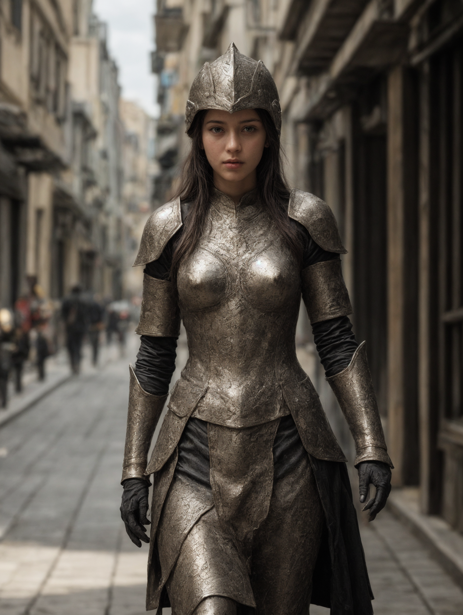 a woman in armor is walking down a street with a sword in her hand and a helmet on her head, concept art, fantasy art, epiCRealism, <lora:more_details:0.5>