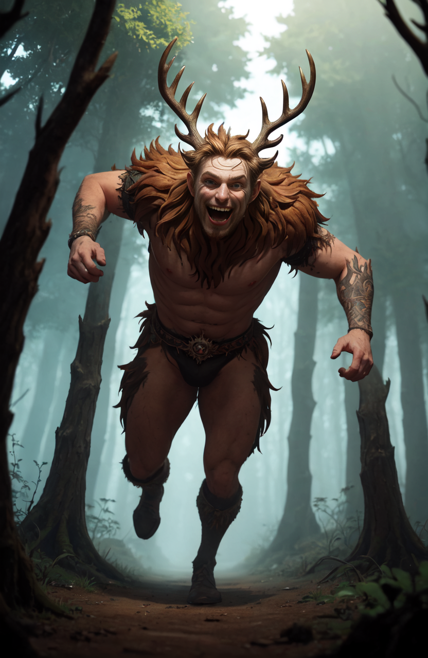 full body photo of Herne the Hunter, rugged male, (alluring, sexual:1.4), (manic:1.3) laughing at joke, (medieval:1.4) (forest deer stag background:1.3),brown eyes, vivid colors, Messy hair, in action, (crazy look), (laugh),extends a hand to the viewer, ultra detailed fantasy, dynamic lighting, atmosphere lighting, perfect eyes, sharp focus, 8k high definition, insanely detailed, intricate, (perspective:1.3)