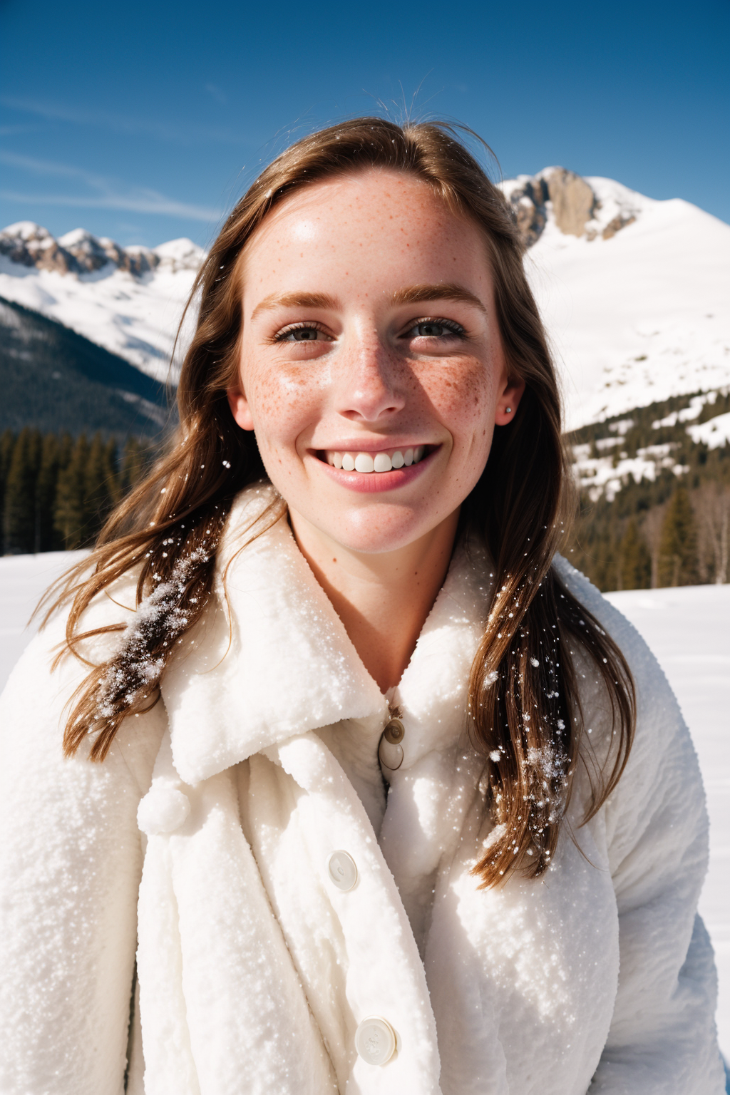 close-up portrait of beautiful smiling woman with freckles, snow-covered mountain, full body, 16mm, 35mm, vivid colors, high quality, white balance, kodak film, high detail