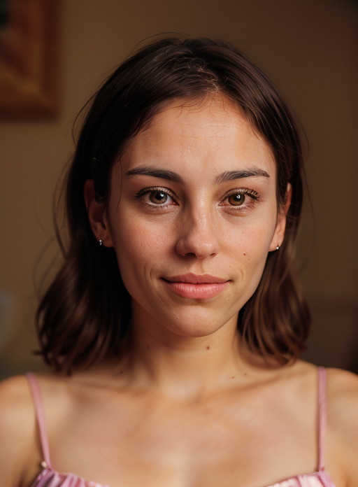 AmyJoJohnson, <lora:AmyJoJohnson-v15-byShurik:1> In this captivating photo, taken from the point of view of the viewer sitting at a dinner table, a woman wearing a charming pink sundress captures our attention. (Best quality: 1.3) The close-up shot accentuates her blushing cheeks and the subtle expression of both embarrassment and deep affection in her eyes. (Masterpiece: 1.3) The soft hues of the sundress complement her natural beauty, while the embarrassment adds a touch of innocence and vulnerability to her demeanor. (Detailed: 1.2) The lighting highlights the contours of her face, casting a gentle glow that enhances her radiant smile. (Soft lighting: 1.4) The woman's gaze towards the viewer reveals the unmistakable signs of being in love, as her eyes sparkle with admiration and tenderness. (Embarrassed and in love: 1.3) This portrayal captures a beautiful moment of connection and affection between the woman and the viewer, evoking a sense of warmth and intimacy. (Full body: 1.3)